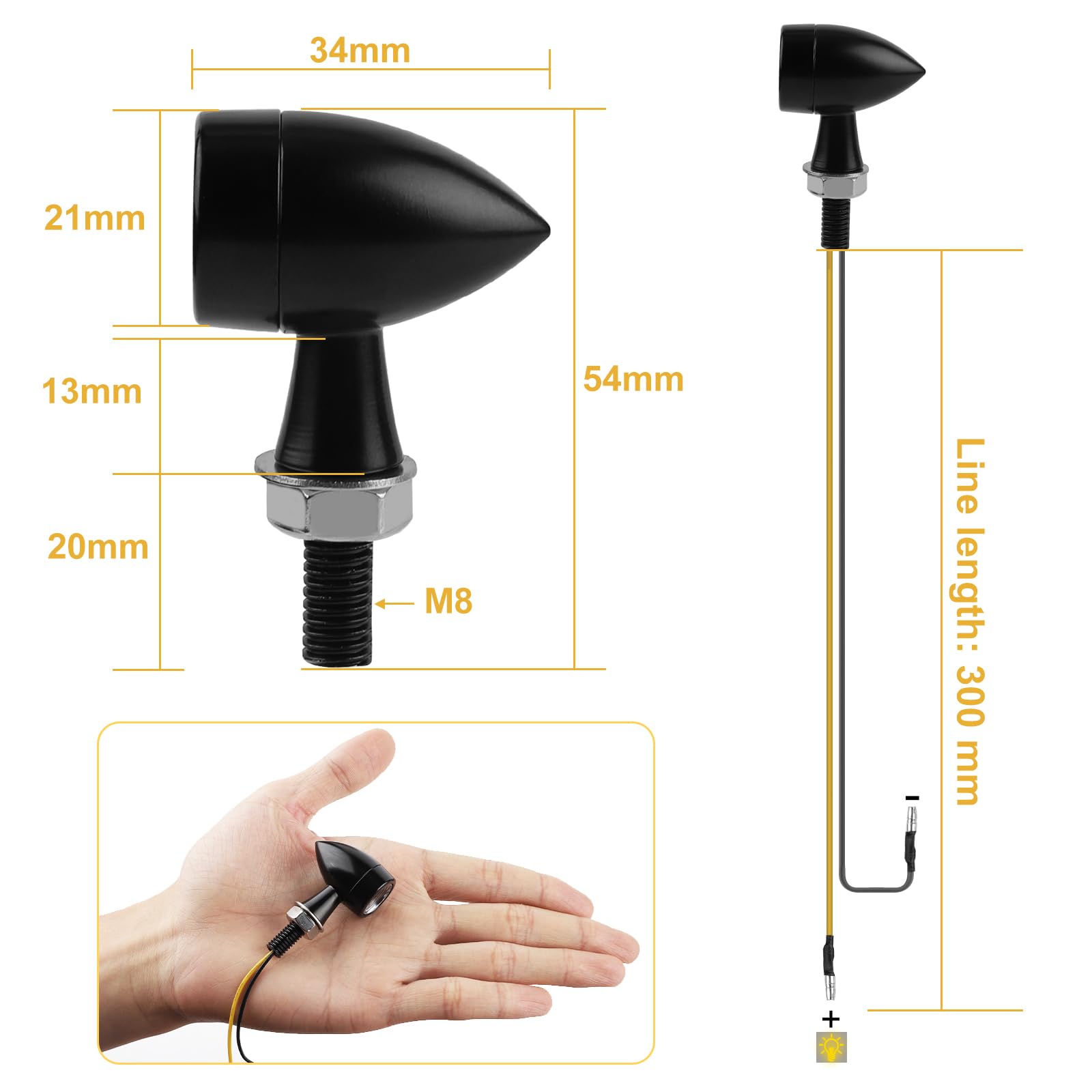 Bessere Sichtbarkeit auf deinem Motorrad! Diese 4 LED-Blinker sind super hell mit je 5 LEDs. Nur 12V, wenig Stromverbrauch. IP65 wasserdicht - hält jedem Wetter stand! Mini-Design sieht stylisch aus. Einfach montieren: schwarzes Kabel Minus, gelbes Kabel Plus. Passt für Motorräder, Scooter, Quads, Cruiser. Einfach einbauen und sicherer unterwegs sein!