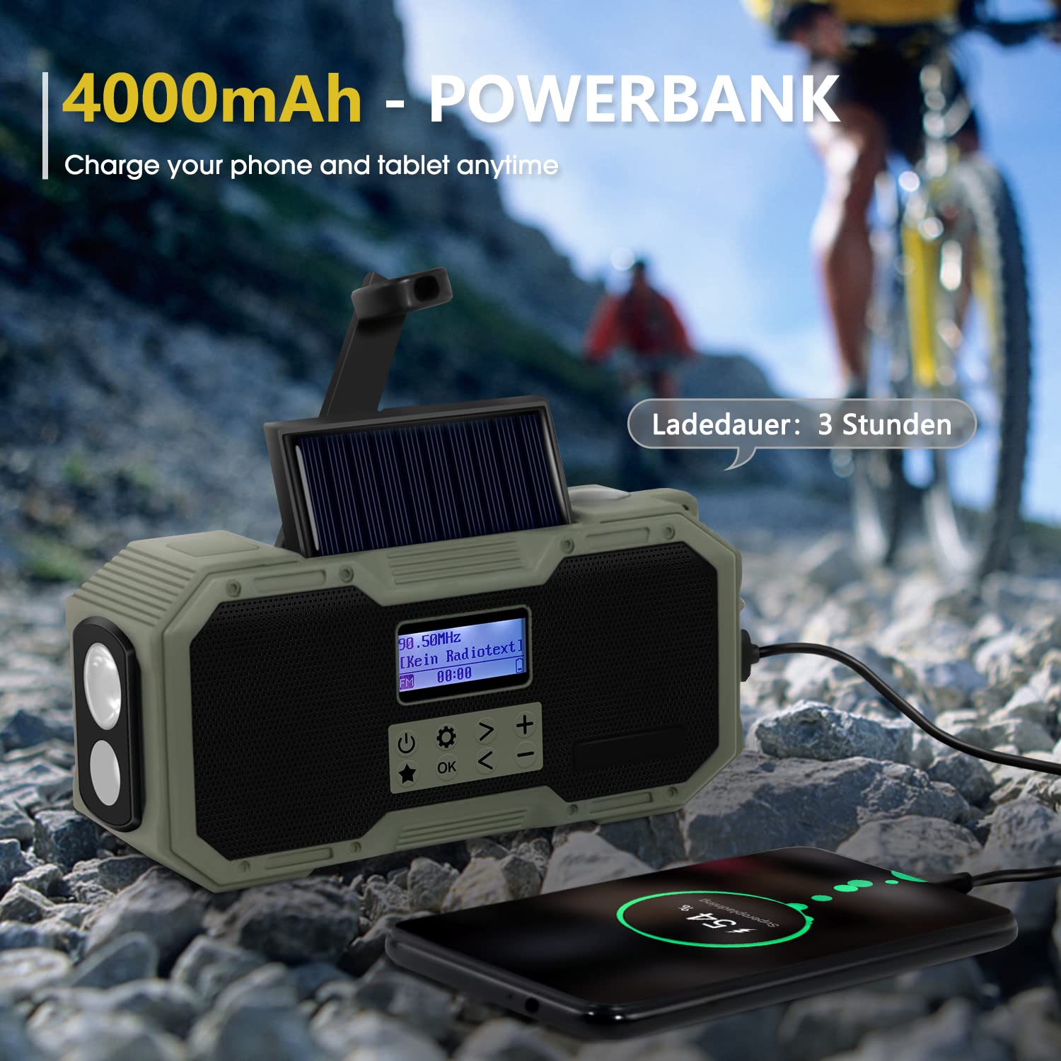 Das All-in-One-Notfall- und Campingradio! Spielt UKW, DAB, DAB+ und Bluetooth 5.0 mit 14W Sound. Integrierte 5000mAh-Powerbank lädt dein Smartphone. Mit LED-Campinglampe (3 Farbtemperaturen), Taschenlampe und SOS-Alarm. Per USB-C, Solar oder Handkurbel aufladbar. IPX5 spritzwassergeschützt. Ideal für Camping, Garten, Wohnmobil und Blackouts. Läuft bis zu 13h (Radio) bzw. 12h (Bluetooth). Nie wieder ohne Strom und Info – dein zuverlässiger Begleiter für Outdoor und Notfälle!