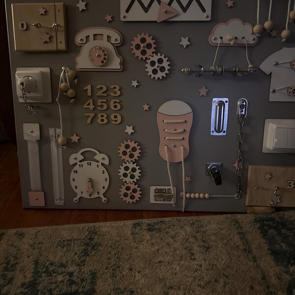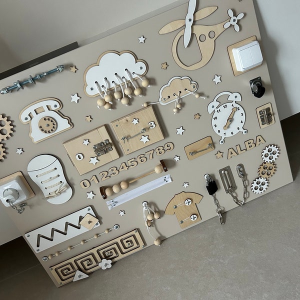So macht Lernen Spaß! Dieses süße Hund-Busy Board fördert spielerisch die Feinmotorik deines Kindes. Mit Reißverschlüssen, Schaltern und Schnallen - alles, was kleine Hände lieben. Perfekt für Kinder von 3-6 Jahren nach der Montessori-Methode. Einfach an der Wand montieren und schon kann der Spielspaß beginnen. Ideal fürs Kinderzimmer, Kindergarten oder als pädagogisches Spielzeug. Fördert Konzentration, Kreativität und Problemlösungsfähigkeiten. Ein tolles Geschenk für Geburtstage oder Weihnachten! Dein Kind wird stundenlang beschäftigt sein und dabei ganz nebenbei wichtige Fähigkeiten entwickeln.