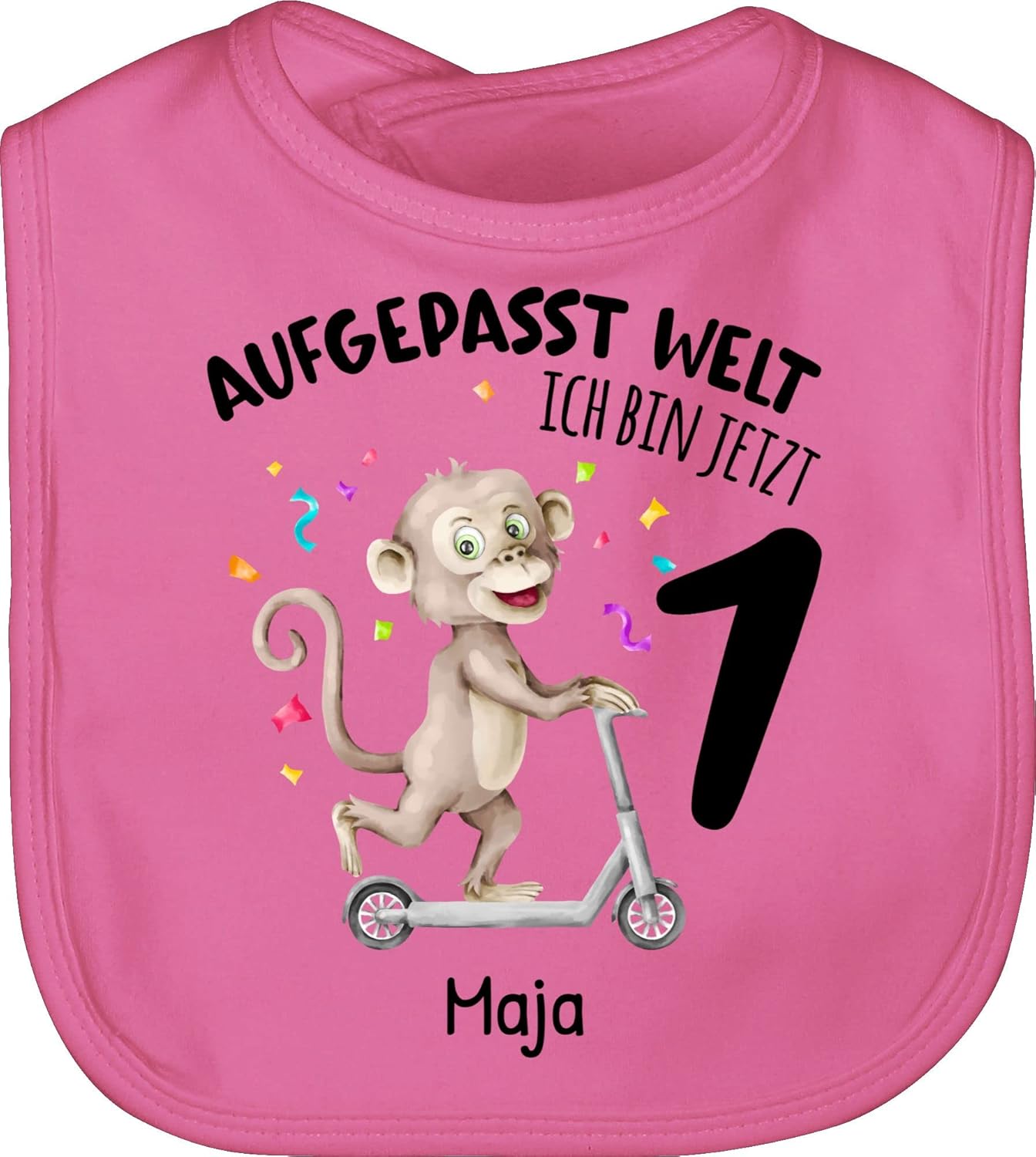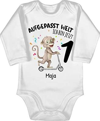 Dein Kleines wird 1? Dann muss gefeiert werden! Mit diesem personalisierten Baby Body von Shirtracer. 100% Baumwolle, mega weich und bequem. Envelope-Halsausschnitt, damit er easy an- und ausgezogen werden kann. Mit süßem Affen-Motiv und dem Spruch 'Aufgepasst Welt – ich bin jetzt 1!' Druckknöpfe am Bein, nickelfrei und absolut unbedenklich. Perfekt zum Rumkrabbeln und Feiern. Waschbar bei 30°C, also kein Stress bei Flecken. Mach deinem Kind und dir ne Freude – bestell den Body mit Namen und lach zusammen über den niedlichen Affen!