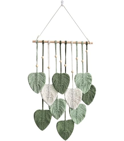 Bringe boho-flair in deine vier Wände! Dieser handgewebte Makramee-Wandbehang verleiht jedem Raum sofort gemütliche Atmosphäre. \\n\\nMaße 70x20 cm - perfekt für Wohnzimmer, Schlafzimmer, Flur oder Büro. Aus natürlicher Baumwolle und Holz für einen ökologischen Look der zeitlos schön ist. \\n\\nFünf individuell zuschneidbare Blätter sorgen für lebendige Optik und natürliche Akzente. Der stabile Holzstab und die Holzperlen garantieren langlebige Qualität. \\n\\nEinfach aufzuhängen - sofortiger Wohlfühlfaktor ohne großen Aufwand. Passt zu minimalistischen Einrichtungen genauso wie zu ausgefallenen Boho-Stilen. \\n\\nPerfekt über dem Sofa, am Kamin, im Flur oder als Blickfang in jedem Raum. Schafft eine warme und einladende Atmosphäre. \\n\\nEin wunderbares Geschenk für Einzug, Hochzeit, Geburtstag oder einfach um sich selbst eine Freude zu machen. Handgemachte Schönheit für dein Zuhause!