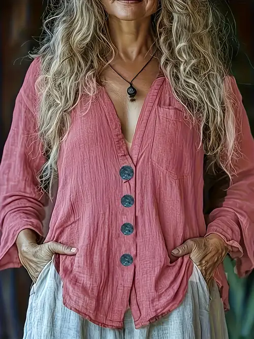 Damen Sommer Tops Boho Style - Lockere Bluse Mit V-Ausschnitt Und Knopfleiste