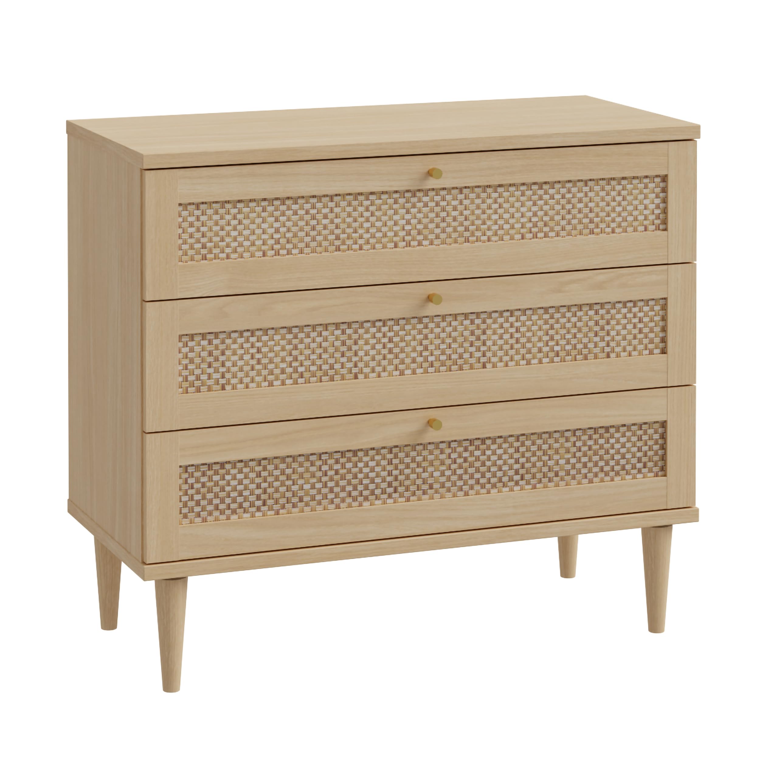 Bring Boho-Charme in dein Zuhause! Diese wunderschöne GLENKEEN Kommode mit 89,8 cm Breite passt auch in kleinere Räume perfekt. Die drei Schubladen mit natürlichem Rattan-Geflecht und warmem Valencia Eiche Dekor sehen aus wie aus einem Boutique-Hotel. Super stabil aus hochwertigem Holzwerkstoff - hält auch bei täglicher Nutzung problemlos stand. Pflegeleichte Oberfläche - einfach abwischen und schon sieht sie wieder wie neu aus. In Europa produziert für höchste Qualitätsstandards. Perfekt fürs Schlafzimmer, Wohnzimmer oder als Ablage im Flur. Einfach aufbauen und sich über den neuen Wohlfühl-Look freuen. Dein Zuhause wird sofort gemütlicher!