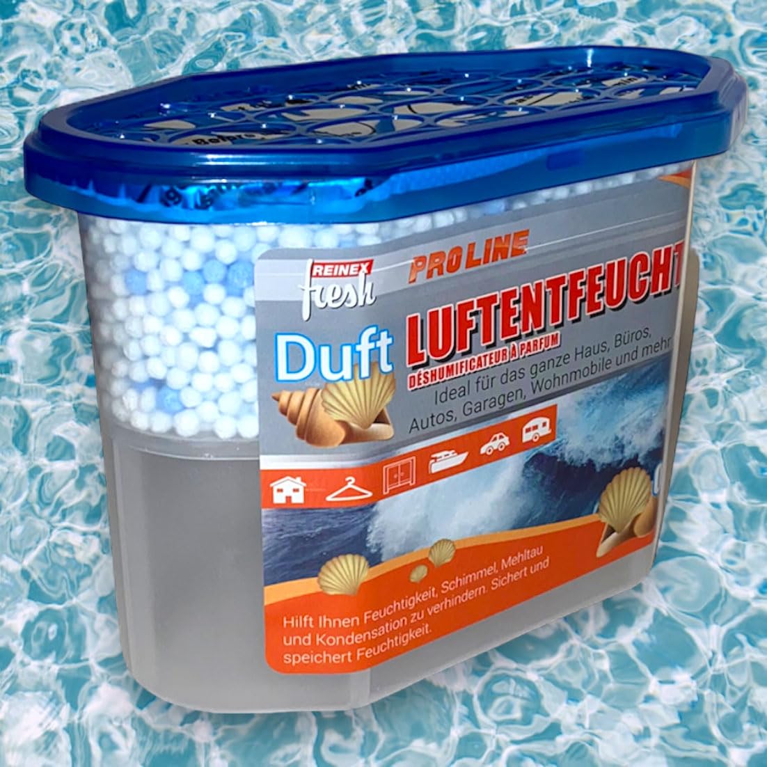 Schluss mit feuchter Luft und muffigen Gerüchen! Diese 6 Raumentfeuchter-Boxen mit je 230g Granulat und frischem Ocean-Duft machen deine Räume wieder angenehm. Für Räume bis 50m² geeignet - perfekt für Keller, Schrank, Bad, Küche oder sogar Auto und Wohnmobil! Das Granulat bindet überschüssige Feuchtigkeit und beugt so Schimmel, Stockflecken und Korrosion vor. Ganz ohne Strom - einfach hinstellen und wirken lassen! Die praktische Sammelbox verhindert Überlaufen und muss nicht beaufsichtigt werden. Bis zu 70 Tage Wirkung pro Box, je nach Luftfeuchtigkeit. Mit den Maßen 150x100x85mm und 295g Gewicht ist sie kompakt und unauffällig. Einfach aufstellen und von einem gesünderen Raumklima profitieren! Besonders praktisch für Ferienhäuser oder wenig genutzte Räume. Einfach den Deckel abnehmen und das Granulat wirkt - mehr Komfort gegen Feuchtigkeit geht nicht! Achtung: Enthält Substanzen, die Augenreizungen verursachen können - von Kindern fernhalten und Schutzhandschuhe tragen!
