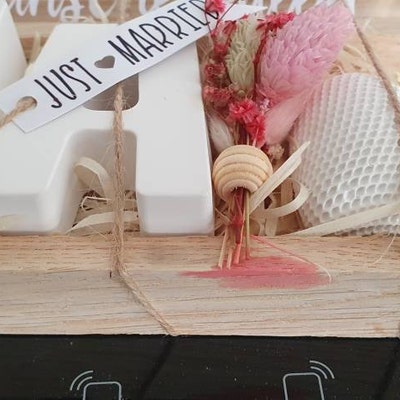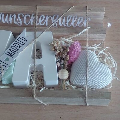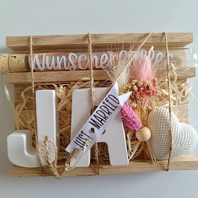 Suchst du ein besonderes Geschenk für ein Brautpaar? Diese wunderschöne Holzbox ist die perfekte Lösung! In der handlichen Box (11,4×6×17,5 cm) findest du einen zarten Trockenblumenstrauß, der für immer schön bleibt, ein magisches Schlüssel-Fläschchen für Wünsche und eine bezaubernde LED-Lichterkette die die Box im Dunkeln wie einen Sternenhimmel erstrahlen lässt. Das persönliche Highlight: Das gravierte Holzherz und die Acrylplatte können mit individuellem Text personalisiert werden - so wird das Geschenk wirklich einzigartig. Perfekt für Geldgeschenke, aber auch für Schmuck oder andere kleine Überraschungen. Die Box sieht nicht nur toll aus, sondern wird zur bleibenden Erinnerung an den großen Tag. Ein Geschenk, das von Herzen kommt und das Brautpaar garantiert begeistern wird!