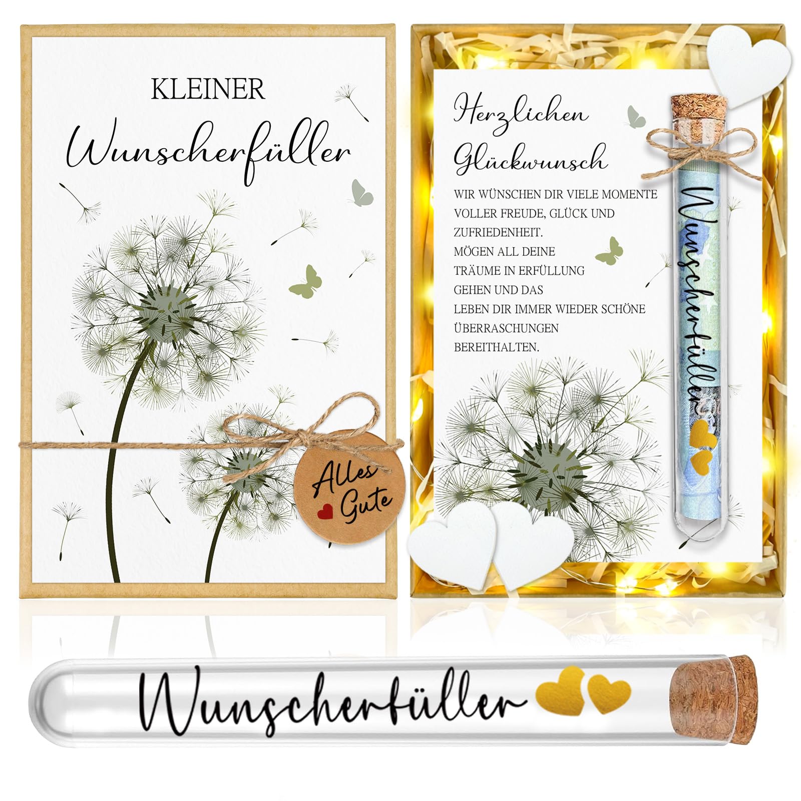 Wow, diese Wunscherfüller-Geschenkbox ist einfach magisch! Perfekt für Geldgeschenke zu Weihnachten, Geburtstag oder Silvester. Im hübschen Löwenzahn-Design symbolisiert sie Hoffnung und neue Chancen. Das komplette Set enthält alles, was du brauchst: Aufkleber, Grußkarten, Juteschnur, warmweiße LED-Lichterkette, Raffia, Glasröhrchen und weiße Herzen. Einfach das Geld ins Glasröhrchen stecken und dein persönliches Kunstwerk gestalten! Die LED-Lichter sorgen für eine gemütliche Atmosphäre und machen das Geschenk zum absoluten Hingucker. Die Box misst 18x12x3 cm - ideal für Banknoten oder Gutscheine. Viel mehr als nur Geld - es transportiert echte Emotionen und Wertschätzung. Dein Geschenk wird garantiert in Erinnerung bleiben!