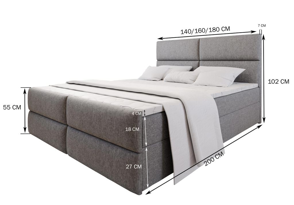 Träumst du von erholsamem Schlaf und stylischem Wohnen? Das Masseno BARINO Boxspringbett vereint beides! Das Komplettset in Grau (Paros 06) bringt alles mit: weiches Kopfteil zum gemütlichen Lesen, praktischen Bettkasten für Stauraum und eine hochwertige Matratze für optimalen Liegekomfort. Die Maße von 180x200 cm bieten reichlich Platz, während die Polsterung mit 7 cm Dicke für gemütliche Stunden sorgt. Besonders praktisch: Der große Stauraum unter dem Bett - perfekt für Bettwäsche, Decken oder saisonale Kleidung. So bleibt dein Schlafzimmer immer aufgeräumt! Die Härtegrade H2/H3 der Matratze bieten für jeden die passende Unterstützung. Einfache Montage ohne Spezialwerkzeug - in kurzer Zeit steht dein neues Wohlfühl-Reich. Das zeitlose Design passt zu jedem Einrichtungsstil und der kuschelige Stoff lädt zum Wohlfühlen ein. Für alle, die Wert auf Qualität, Komfort und praktische Lösungen legen!