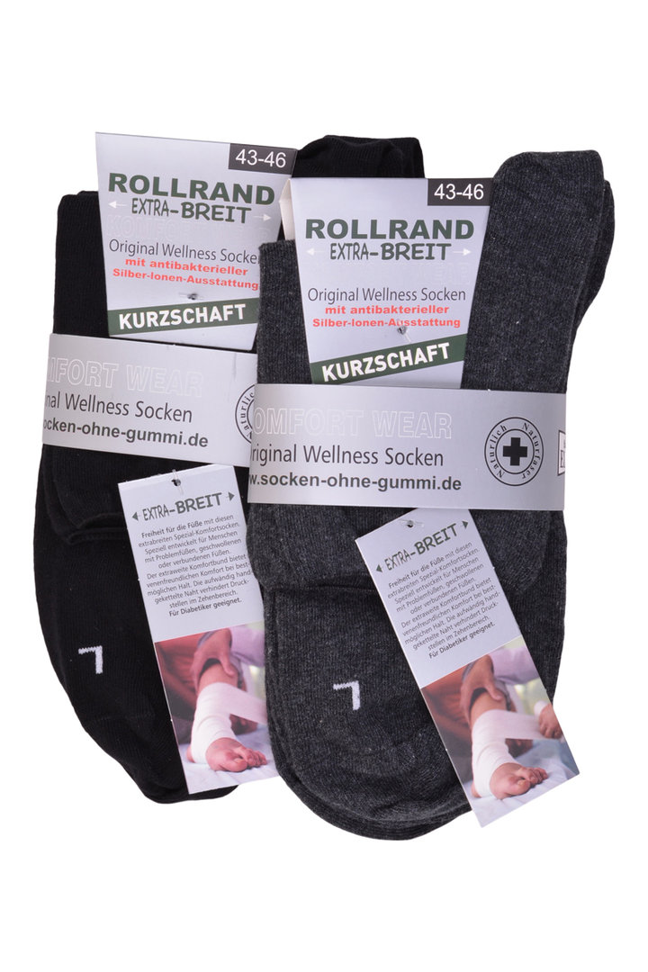 Wow, diese Wellness-Socken von WOWERAT sind ja richtig bequem! Extra breit geschnitten - perfekt für Menschen mit Problemfüßen oder dickeren Waden! Aus extrafeiner 200-Nadel Qualität - total atmungsaktiv und weich. Der Piqué-Komfortbund hat kein Gummi - schnürt nicht ein aber sitzt trotzdem perfekt! Handgekettelte Naht - keine Druckstellen an den Zehen! Im 2er-Pack in schwarz - auch in Übergrößen 51-54 erhältlich! Verhindert übermäßiges Schwitzen - deine Füße werden's dir danken! Einfach mal anziehen - du wirst spüren, wie gut Socken eigentlich sein können!