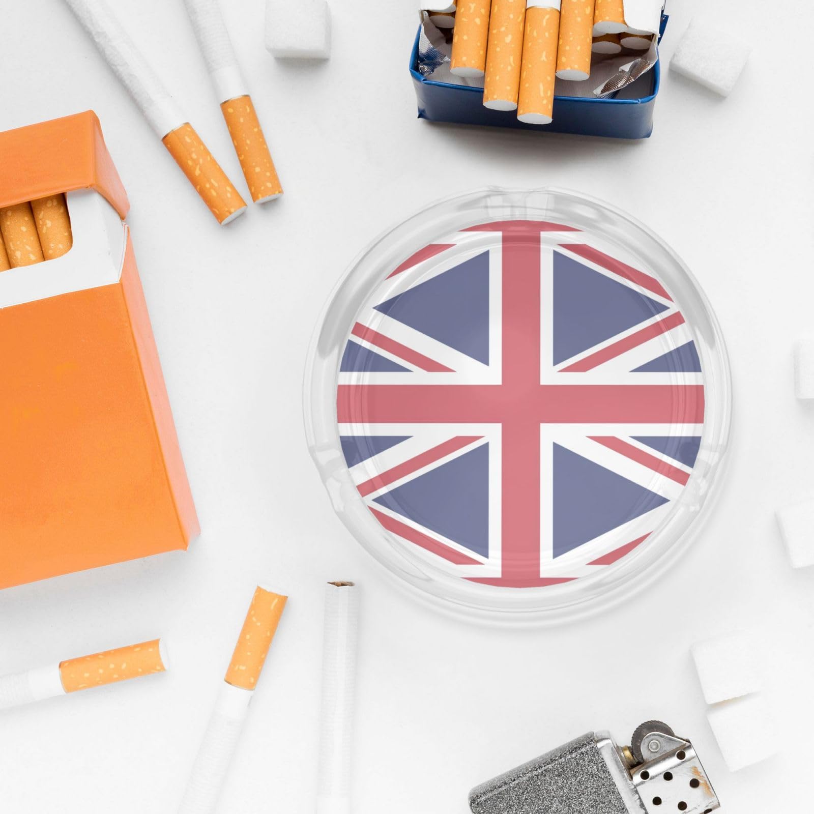 Stilvoll rauchen mit diesem eleganten Glasaschenbecher! Das markante Design mit der britischen Flagge auf der Unterseite macht ihn zum echten Hingucker. Aus hochwertigem, bleifreiem Glas gefertigt, ist er kristallklar und blasenfrei. Die Kerben am Rand halten deine Zigarette sicher fest - kein lästiges Wegrollen mehr! Der gerade Zylinder hält die Asche zuverlässig im Inneren und verhindert, dass sie herumfliegt. Fein polierte Kanten schützen deine Hände vor Verletzungen. Mit 8,4 cm Durchmesser und 3,6 cm Höhe ist er kompakt genug für jeden Schreibtisch, aber geräumig genug für den täglichen Gebrauch. Die glatte Innenwand ist super einfach zu reinigen - einfach ausspülen und trocknen lassen. Perfekt für Wohnzimmer, Büro, Konferenzräume oder sogar als Deko-Objekt. Ein durchdachtes und praktisches Geschenk für jeden Raucher in deinem Leben. Ob für dich selbst oder als Mitbringsel - dieser Aschenbecher vereint Funktionalität mit stylischem Design. Ein echter Blickfang für jede Raucher-Ecke!