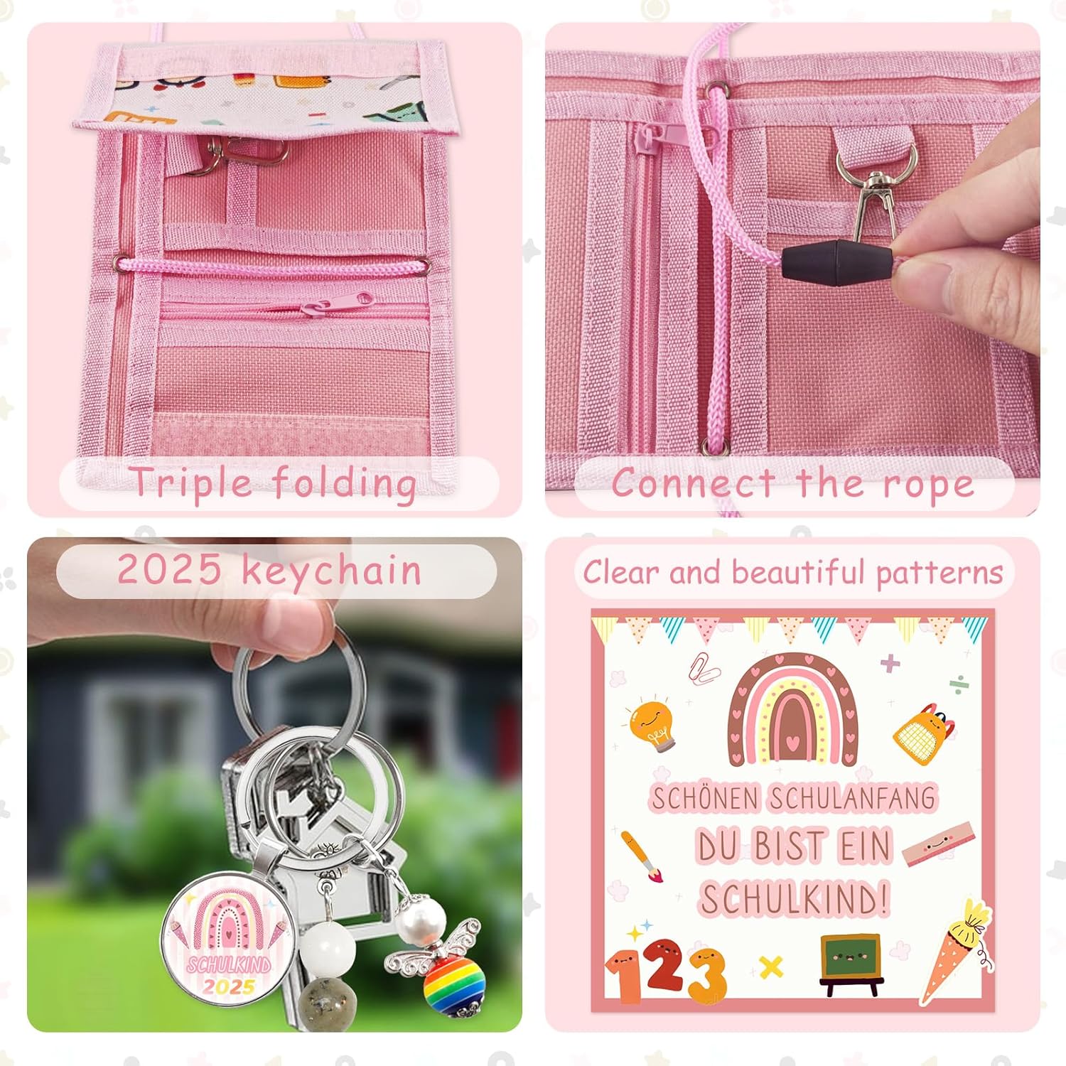 Hey, suchst du ein süßes und praktisches Geschenk zur Einschulung? Dieser bunte Regenbogen-Brustbeutel ist perfekt für Jungen und Mädchen! Aus hochwertigem Nylonstoff, super stabil und sicher. Mit Umhängeband - einfach um den Hals hängen, dann geht nichts verloren. Drin ist genug Platz für Münzen, Karten und kleine Schätze. Der Reißverschluss hält alles sicher verschlossen. Und das pinke Design mit den Regenbogen ist einfach niedlich - die Kids lieben es! Perfekt nicht nur für die Schule, sondern auch als Geburtstagsgeschenk oder für Weihnachten. So starten die Kleinen voller Freude in den Schulalltag und haben ihre wichtigsten Dinge immer griffbereit. Einfach praktisch und macht richtig Laune!