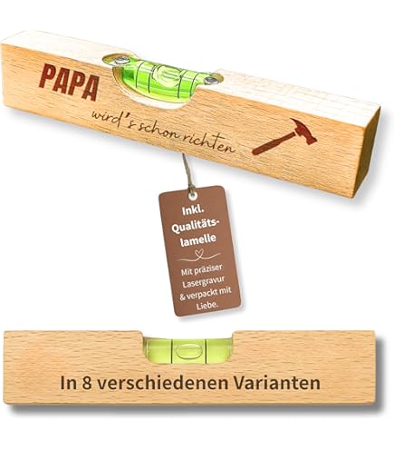 Das perfekte Geschenk für alle, die nicht ganz gerade denken können! Diese charmante Wasserwaage aus massivem Buchenholz mit 15cm Länge bringt garantiert ein Schmunzeln ins Gesicht. Mit einer witzigen Gravur versehen, ist sie zwar nicht für den professionellen Einsatz gedacht, aber umso mehr für die Werkstatt-Deko, den Grillplatz oder das Büro. Jedes Stück ist ein Unikat mit natürlicher Maserung und fühlt sich richtig hochwertig an. Perfekt als Geschenk zum Vatertag, Geburtstag oder einfach als kleine Aufmerksamkeit für Papa, Opa oder den besten Kumpel. Leicht und handlich passt sie in jede Geschenkbox und sorgt für den nächsten Lacher. Ein Geschenk, das nicht nur waagerecht liegt, sondern auch emotional trifft!