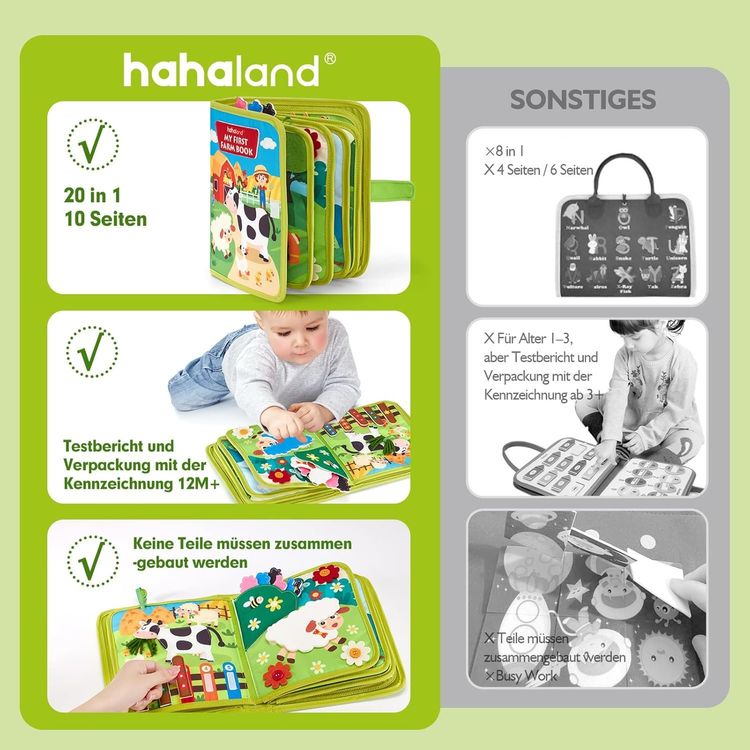 Hey Eltern, dieses GREATRICH Busy Board ist einfach genial für kleine Entdecker ab 1 Jahr! Das 20-in-1 Spielzeug kombiniert ein Activity-Buch mit einem Sensorik-Board und bietet unendlichen Spielspaß. Mit 8 Seiten und verschiedenen Aktivitäten wie Blumen zuordnen oder Obst ernten fördert es spielerisch die Feinmotorik und Hand-Augen-Koordination. Absolute Sicherheit für kleine Hände: keine scharfen Kanten, handgenäht und extrem stabil. Perfekt als Reisespielzeug - kompakt, leicht und beschäftigt Kinder stundenlang ohne Bildschirme. Ob im Auto, Flugzeug oder zuhause, dieses Montessori-Spielzeug ist immer eine gute Wahl. Es fördert kognitive Fähigkeiten, Kreativität und Alltagskompetenzen. Ein tolles Geschenk für Kinder von 1-3 Jahren zu Geburtstagen, Weihnachten oder einfach so. Einfach ein pädagogisch wertvolles Spielzeug, das sowohl Kindern als auch Eltern gefällt!