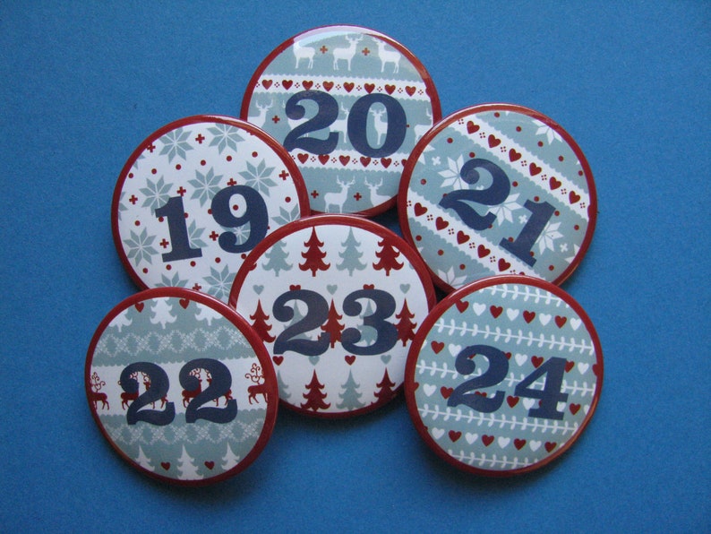 Weihnachtszauber pur! Diese handgefertigten Zahlen-Buttons aus Deutschland machen deinen Adventskalender zu etwas Besonderem. Jeder der 24 Buttons zeigt eine niedliche Wichtel-Figur in verschiedenen Farben und Mustern - da strahlen Kinderaugen! Mit 3,8 cm Durchmesser sind sie gut sichtbar, aber nicht zu groß. Aus hochwertigen Materialien gefertigt, halten sie Jahre lang und können immer wieder verwendet werden. Egal ob für Stoffbeutel, Säckchen oder selbstgemachte Kalender - diese Buttons verleihen jedem Adventskalender einen persönlichen Touch. Die liebevollen Details der Wichtel-Figuren sorgen für täglich neue Vorfreude. Einfach anbringen und die Weihnachtszeit genießen. Perfekt als Geschenk für Weihnachtsliebhaber oder um den eigenen Kalender zu verschönern. Mach die Wartezeit auf Weihnachten zu einem besonderen Erlebnis!