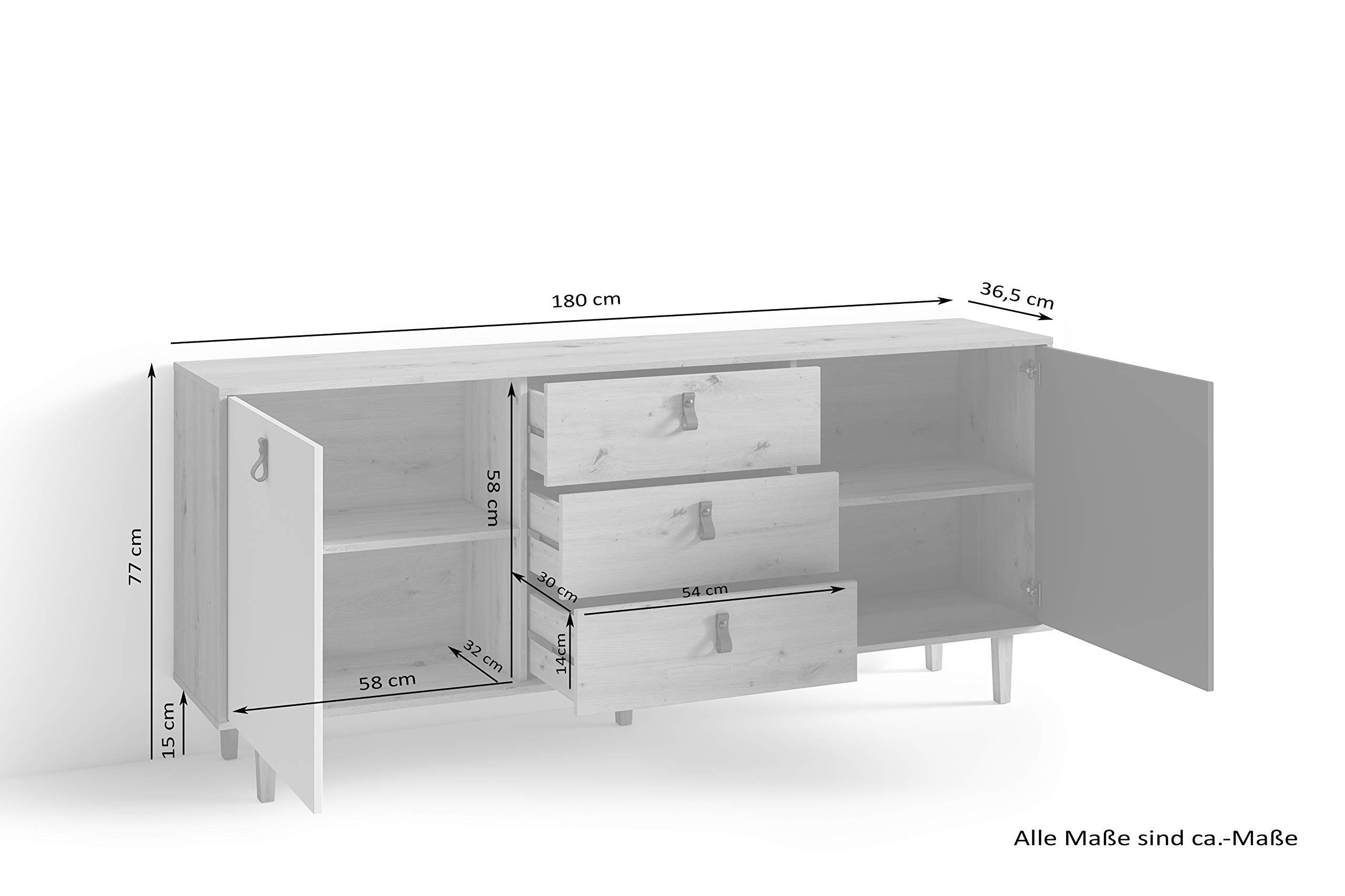 Dieses byLIVING Sideboard ist ein echter Hingucker für dein Wohnzimmer! Mit 120cm Breite, 77cm Höhe und 36,5cm Tiefe bietet es super viel Stauraum. Eine Tür und drei Schubladen - perfekt für DVDs, Zeitschriften oder Wohnaccessoires. Der Korpus in Artisan Eiche-Optik sieht total edel aus, kombiniert mit weißen und grauen Fronten im skandinavischen Design. Die massiven Eichen-Füße geben Stabilität und sehen klasse aus. Aus FSC-zertifiziertem Holz - gut für die Umwelt! Die dunkelbraunen Kunstleder-Griffe machen das Öffnen super einfach. Perfekt für TV-Unterbau oder als Raumteiler. Einfach aufbauen und sofort dein Zuhause verschönern!