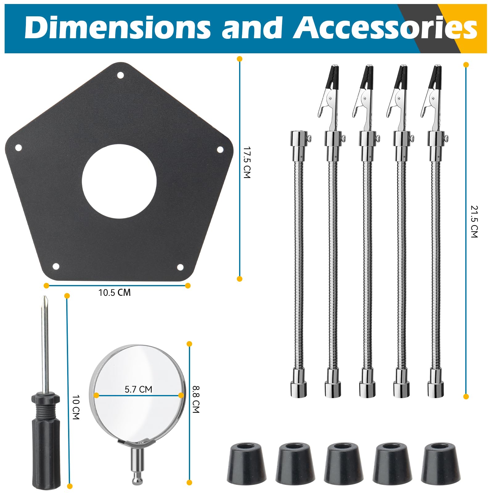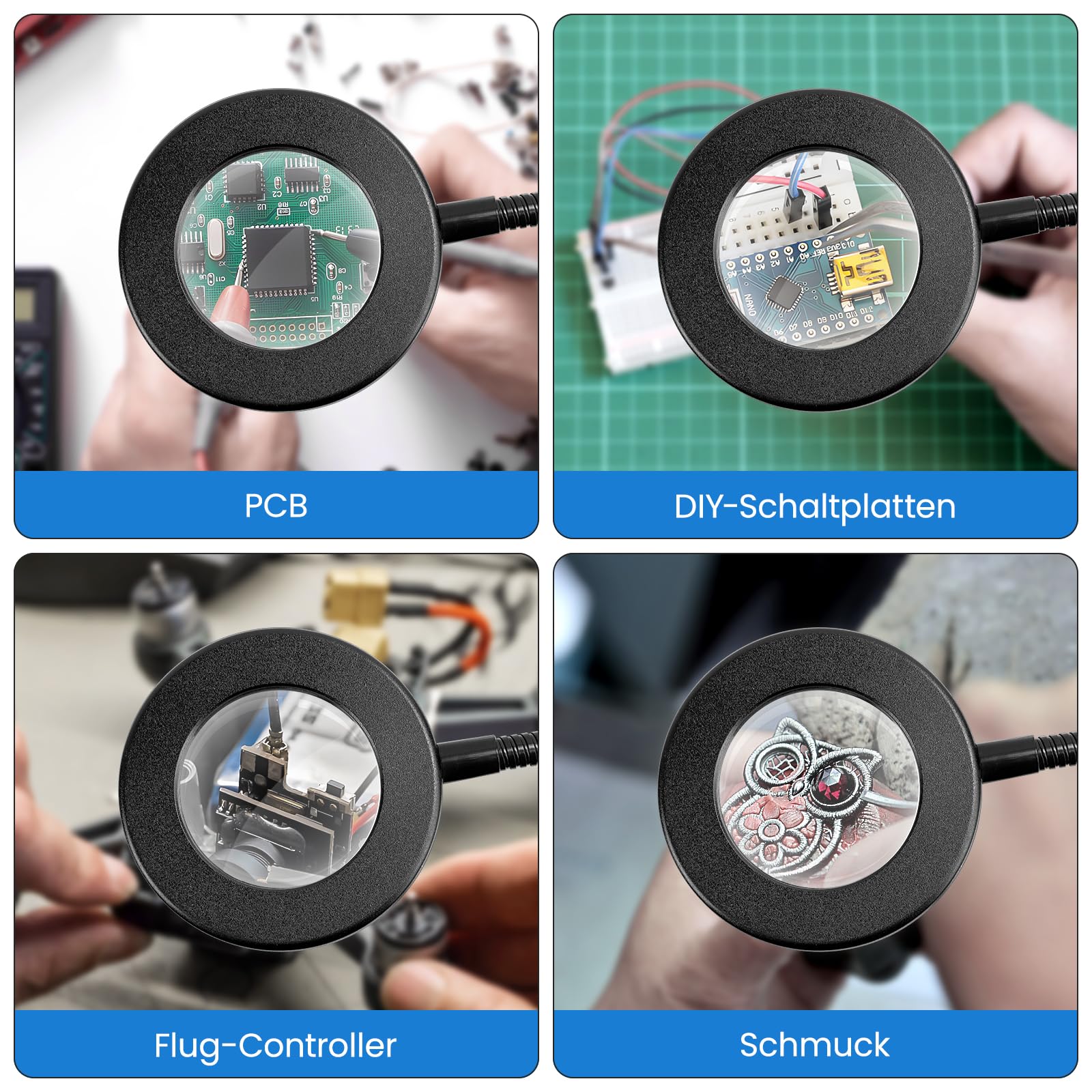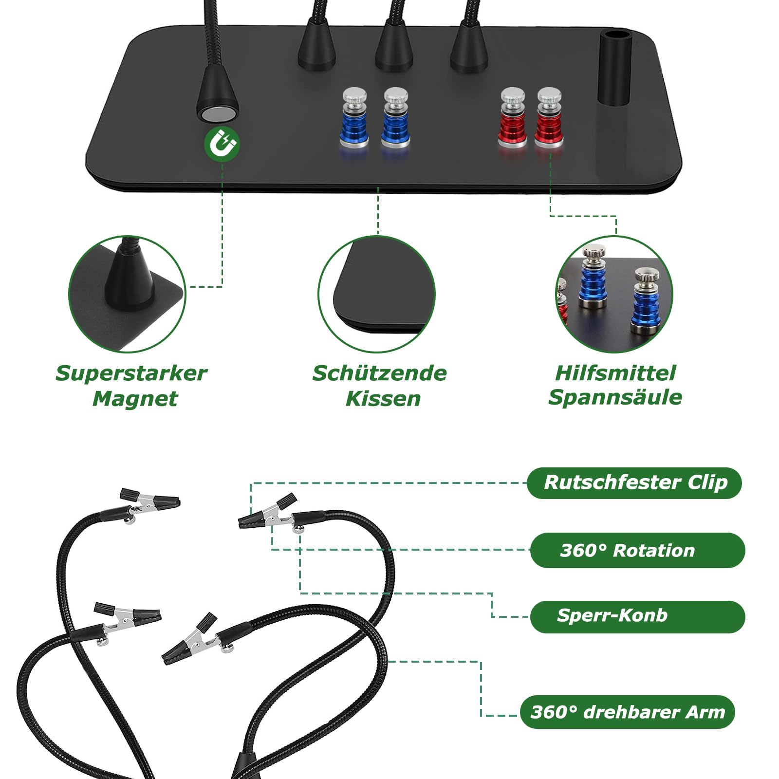 Endlich beide Hände frei beim Löten! Diese professionelle Lötstation mit 4 flexiblen Magnetarmen hält deine Bauteile sicher fest. Die verstellbare 10X Vergrößerungslupe mit Glaslinse liefert kristallklare Sicht auf kleine Lötstellen und feine Details. Integrierte LED-Beleuchtung mit 10 Helligkeitsstufen und 5 Farbtemperaturen (3000K-6000K) sorgt für perfekte Ausleuchtung bei jeder Arbeit. Die starken Basismagnete halten die Arme stabil in Position, die abnehmbaren Krokodilklemmen mit Gummihülsen schützen empfindliche Komponenten. Der stabile Metallständer kann freistehend oder mit der kräftigen Klemme befestigt werden. Ideal für Elektronik-Bastler, Modellbauer, Juweliere und Hobbyisten. Perfekt zum Löten, Reparieren, Malen oder für jede feine Arbeit, die Präzision erfordert. Einfach aufbauen, keine Werkzeuge nötig - sofort einsatzbereit für deine nächsten Projekte!