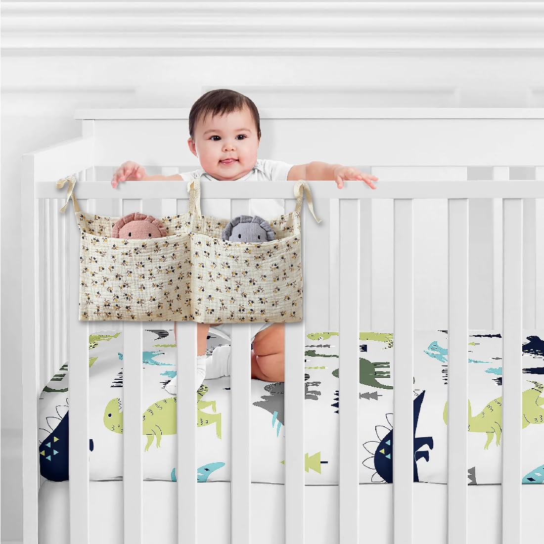 Diese Babybett-Organizer bringen Ordnung ins Kinderzimmer! 2 Stück im Set, je 38x18 cm groß. Aus weichem Baumwollstoff - atmungsaktiv und hautfreundlich. Mit zwei separaten Fächern für Windeln, Feuchttücher, Cremes und Spielzeug. Der verstellbare Kordelzug ermöglicht einfaches Aufhängen am Bettgestell, an der Wand oder Tür. Maschinenwaschbar bei 30°C (nicht im Trockner). Alles griffbereit für nächtliche Wickelaktionen! Super praktisch und sieht auch noch hübsch aus. Perfekt als Geschenk zur Geburt oder zum Einzug.
