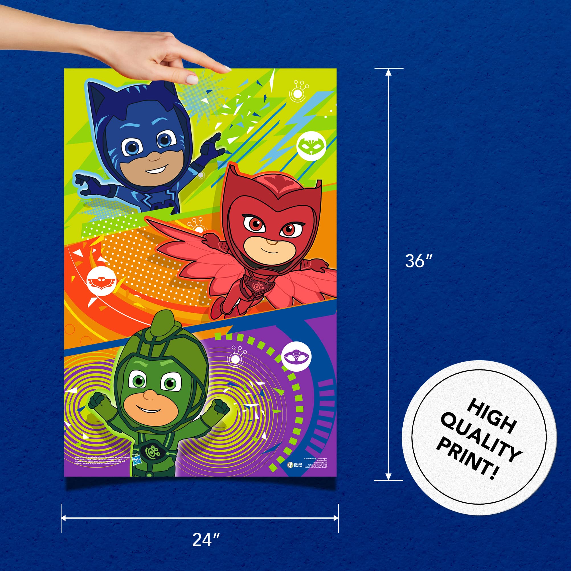 Hol dir die Helden der Nacht in dein Zimmer! Dieses offizielle PJ Masks Poster im Design 1 ist perfekt für alle kleinen Superhelden-Fans. Mit den Maßen 27,9 x 43,2 cm passt es ideal an jede Wand im Kinderzimmer, Büro oder Spielzimmer. Hergestellt in den USA auf hochwertigem Posterpapier, das die Farben richtig gut zur Geltung bringt. Das Besondere: Jedes Poster wird umweltfreundlich in recyceltem Karton geliefert. Als offizielles Lizenzprodukt von Hasbro garantieren wir dir beste Qualität und Authentizität. Desert Cactus steht für Premium-Fanartikel, die einfach Spaß machen. Perfekt als Geschenk oder um das eigene Reich zu verschönern!