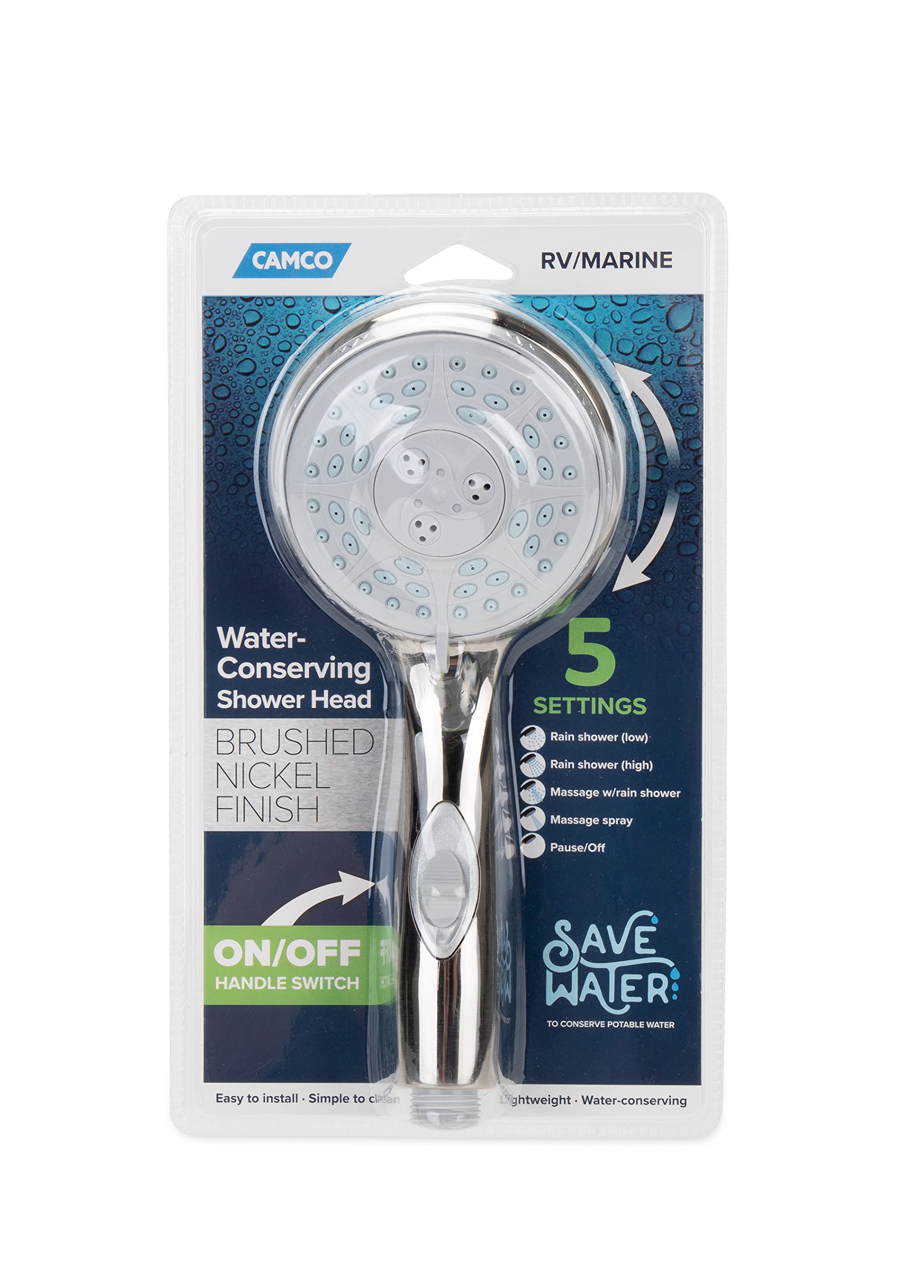 Perfekt für alle Wohnmobil-Fans und Bootsbesitzer! Dieser Camco Duschkopf hilft dir, wertvolles Trinkwasser zu sparen. Mit dem praktischen Ein/Aus-Schalter kannst du das Wasser einfach abstellen während du dich einseifst - so geht umweltbewusstes Duschen! Fünf verschiedene Strahlarten stehen zur Auswahl: von sanftem Regendusche bis zum erfrischenden Massagestrahl. Das gebürstete Nickel-Finish sieht nicht nur klasse aus, sondern ist auch noch langlebig. Einfach anschließen und duschen - Schlauch und Wandhalterung sind allerdings separat zu erwerben. Ob auf Reisen, beim Camping oder auf dem Boot - mit diesem Duschkopf hast du immer eine komfortable Dusche dabei. Besonders praktisch, wenn mal wieder der Wassertank nicht so voll ist. Mach aus jedem Duschgang ein kleines Wellness-Erlebnis, auch unterwegs!
