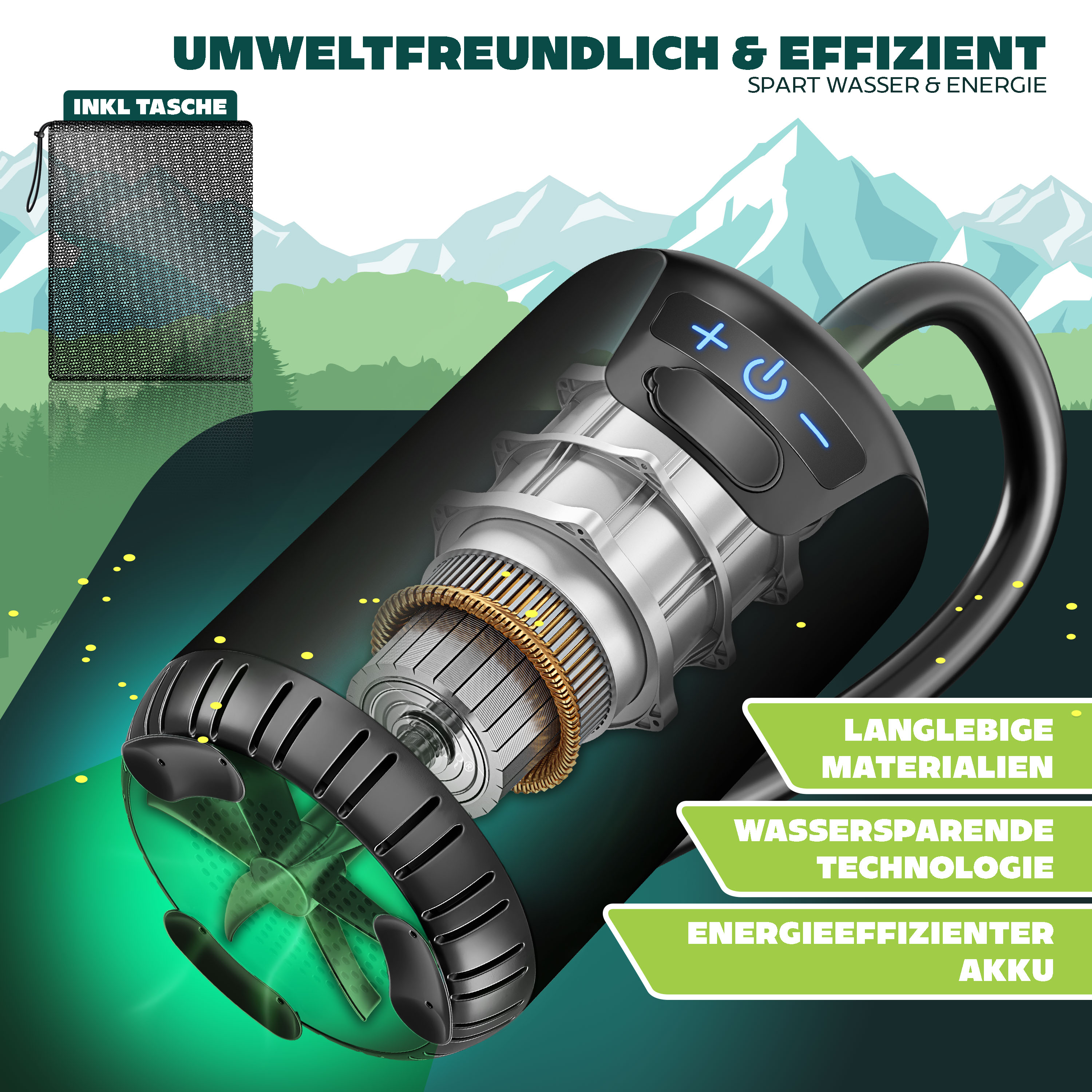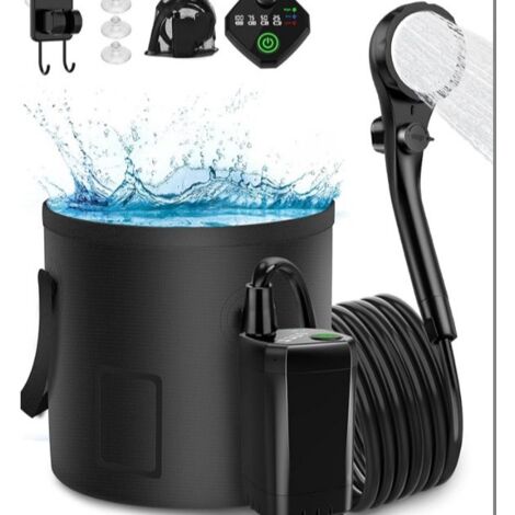 Camping-Fans, diese tragbare Dusche von Mytrix ist ein Game-Changer! Mit 10 Litern pro Minute hast du mehr als doppelt so viel Wasserfluss wie bei anderen Marken - endlich richtig duschen in der Natur! \\n\\nDer riesige 7800mAh Akku hält bis zu 180 Minuten - das reicht für 8-10 komfortable Duschen. Aufladen per USB-C - super praktisch mit Powerbank oder Auto-Adapter. \\n\\n4 Sprühmodi zur Auswahl: Sanft fürs Gesicht, Normal zum Duschen, Stark zum Reinigen und Sprühpistole für Auto oder Garten. Der Duschkopf ist sogar abnehmbar! \\n\\nDas LED-Display zeigt dir immer Batteriestand und Wassertemperatur an. IPX8 wasserdicht - kein Problem bei Regen. Perfekt für Camping, Wandern, Festivals oder die Autowäsche. \\n\\nKommt mit praktischer Netz-Tasche und Badeschwamm. Leicht, kompakt und immer einsatzbereit. Mach deinen Outdoor-Trip noch komfortabler!