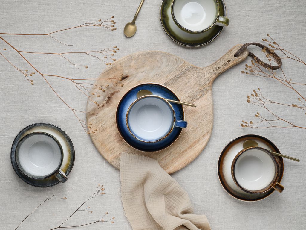 Dieses CreaTable Cascade Geschirrset ist einfach nur traumhaft schön! Die 4 Cappuccinotassen (24cl) mit passenden Untertassen haben diese besondere Reaktivglasur, die wie ein Wasserfall die Farben Blau, Braun, Grün und Stein ineinander laufen lässt. Jedes Stück ist ein Unikat - von Hand aufgetragen, genau wie in der Natur. Das Steinzeug ist mega robust und hält ewig, dazu spülmaschinen- und mikrowellengeeignet. Perfekt für den täglichen Gebrauch oder wenn Besuch kommt. Das Set wird in Deutschland designt und in Premium-Fabriken produziert. Und falls mal was kaputt geht: Es gibt jahrelang Bruchersatz! Echt praktisch, oder?