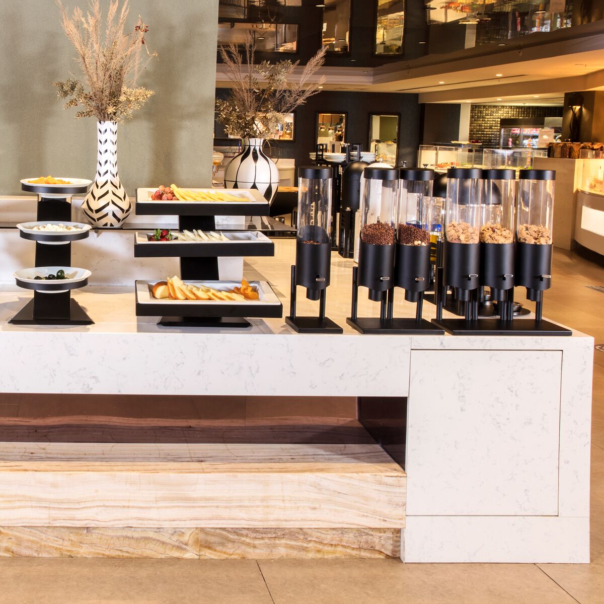 Perfekt organisiertes Frühstücksbuffet! Dieser dreifache Cerealienspender von GGM Gastro ist ideal für Hotels, Restaurants und Catering-Services. Mit drei separaten Fächern (Ø 120 mm) kannst du verschiedene Cerealien oder Müsli-Sorten hygienisch und ansprechend präsentieren. Das Gehäuse aus pulverbeschichtetem Edelstahl in Schwarz ist besonders stabil und langlebig. Einfache Bedienung durch praktischen Hebelmechanismus. Abmessungen: 440 x 200 x 600 mm (B x T x H). Der abnehmbare Deckel erleichtert das Nachfüllen und Reinigen. Hergestellt nach europäischen Hygienestandards mit CE-Kennzeichnung. Nicht geeignet für zuckerhaltiges Müsli. Schaffe eine professionelle Buffet-Station und biete deinen Gästen eine hygienische und komfortable Selbstbedienung. Ein unverzichtbares Utensil für jede gastronomische Einrichtung, die Wert auf Qualität und Präsentation legt!