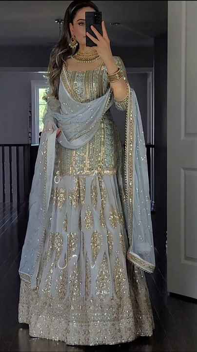 Atemberaubendes indisches Kleid für besondere Anlässe! Dieses MAHEK Lehenga Choli Set besteht aus drei Teilen: Oberteil, Rock und Dupatta. Aus feinem Georgette-Stoff mit aufwendiger Handarbeit. Schwere Stickerei mit Pailletten und Spiegeln - komplett vernäht für perfekte Qualität. Sofort tragbar - kein weiteres Nähen nötig. Verfügbar in Größen M bis XXL: M (96,5cm Brustumfang), L (101,6cm), XL (106,7cm), XXL (111,8cm). Perfekt für Hochzeiten, Partys, Bankette, Abendessen oder Familientreffen. Das Oberteil (Choli) und der Rock (Lehenga) sind beide reich verziert. Der Dupatta (Schal) komplettiert das Ensemble wunderschön. Ein absoluter Hingucker - du wirst alle Blicke auf dich ziehen. Perfekte Wahl für festliche Anlässe wo es etwas Besonderes sein darf. Ein Kleid das Geschichten erzählt!