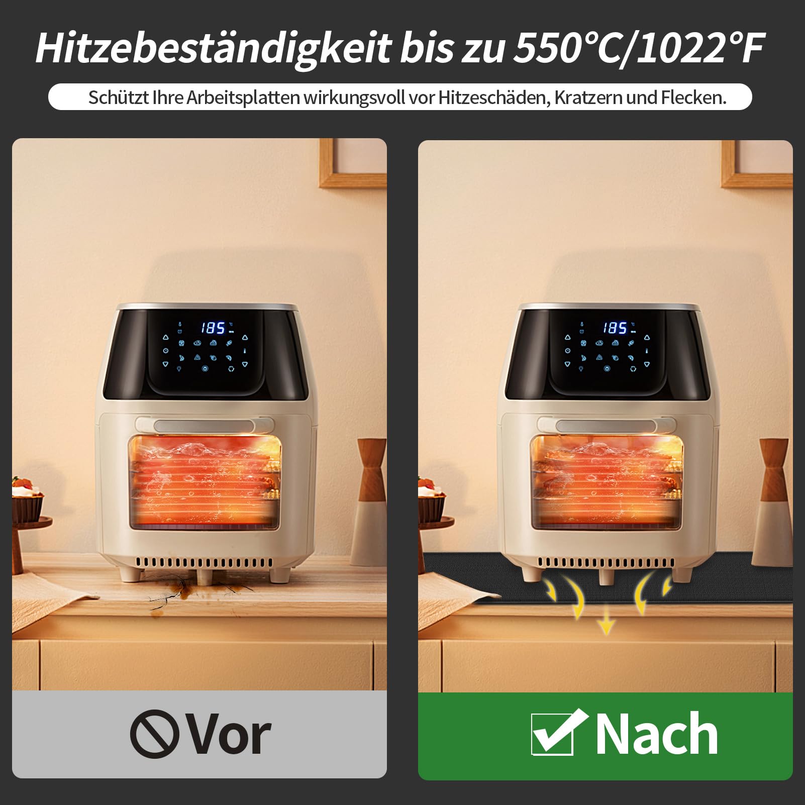 Boah, diese Matte ist echt praktisch! Die hält bis zu 500°C aus - da kann deine Luftfritteuse, Kaffeemaschine oder der Grill ruhig heiß laufen. Aus Fiberglas mit Silikon-Beschichtung, total stabil und die Ränder sind fein vernäht. Rutscht nicht weg und ist wasserdicht, falls mal was daneben geht. Einfach mit nem feuchten Tuch abwischen oder mit Spülmittel sauber machen. Perfekt um deine teure Arbeitsplatte aus Holz oder Marmor zu schützen. Die Maße 50x70 cm sind groß genug für die meisten Küchengeräte. Du kannst schwere Geräte einfach drüber schieben, ohne sie anheben zu müssen. Ob in der Küche, aufm Balkon oder beim Camping - diese Matte ist immer dabei. Sieht auch noch gut aus mit dem neutralen Design. Nach Gebrauch einfach zusammenrollen und platzsparend verstauen. Ein echter Allrounder für jeden Haushalt!