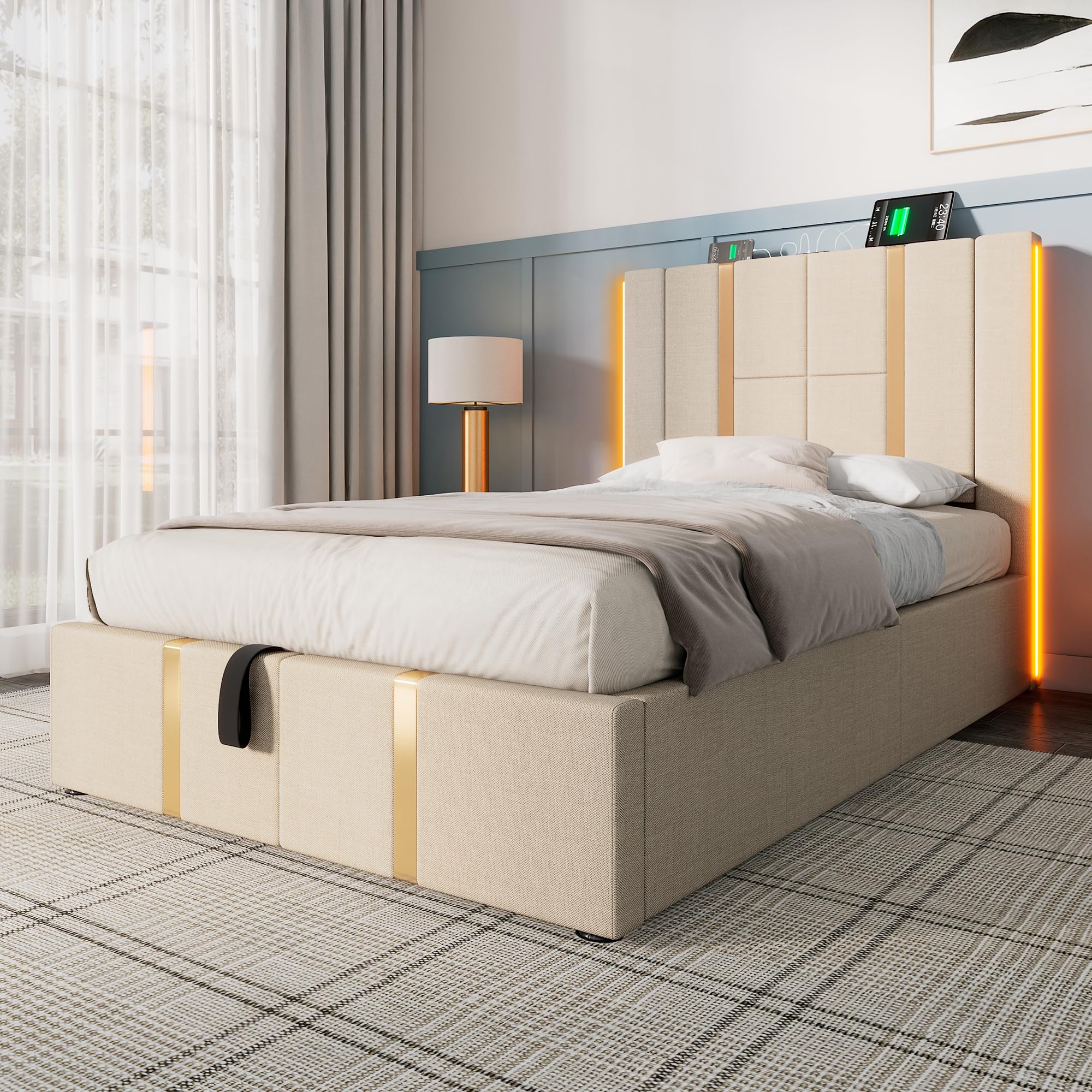 Oslghy Polsterbett 90x200 Cm Mit LED Und USB - Stauraumbett Mit Hydraulik Und Metallrahmen