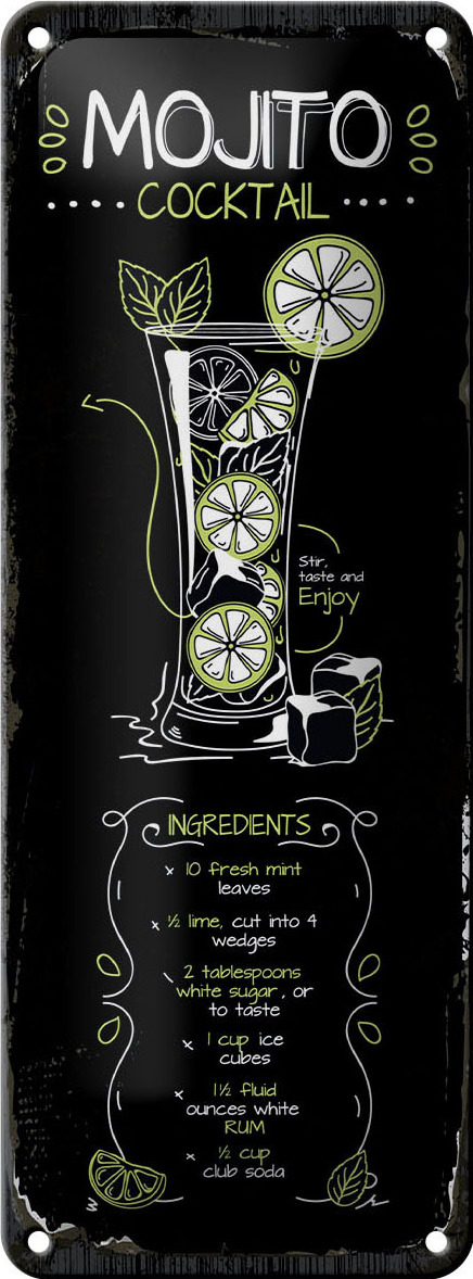 Das perfekte Accessoire für deine Home-Bar! Dieses coole Blechschild im Vintage-Look zeigt dir die besten Cocktail-Rezepte für Mojito, Mai Tai, Aperol, Piña Colada und mehr. Mit den Maßen 20x30cm ist es ideal für die Wand in deiner Bar, im Partykeller oder in der Küche. Aus stabilem, gewölbtem Stahlblech gefertigt, mit abgerundeten Ecken und umgelegten Kanten. Die bereits vorgebohrten Löcher machen die Montage super einfach - einfach aufhängen und dekorieren! Das Retro-Design passt perfekt zu Pub-, Kneipen- oder Industrial-Einrichtungen. Tolle Geschenkidee für Geburtstage, Einzugspartys oder als Mitbringsel für Cocktail-Fans. Auch fürs Büro oder den Hobbyraum geeignet. Mach deine vier Wände noch gemütlicher mit diesem stylischen Blickfang - denn wer braucht schon langweilige Poster, wenn es so coole Blechschilder gibt?