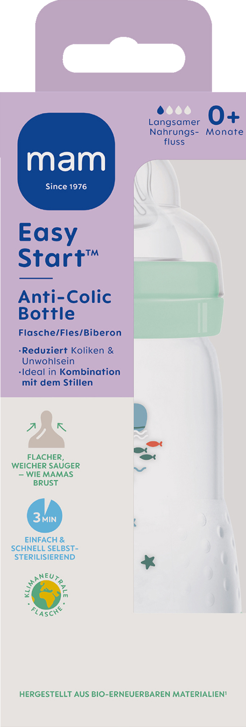 Entspanntes Füttern für dein Baby! Die MAM EasyStart Flasche mit 260ml Fassungsvermögen und Anti-Colic-System reduziert Blähungen und Beschwerden. Der SkinSoft Silikon-Sauger fühlt sich hautähnlich an und wird von 94% der Babys sofort angenommen. Das geniale Selbststerilisations-System reinigt in nur 3 Minuten in der Mikrowelle - super praktisch für unterwegs! Weithals-Design macht die Reinigung zum Kinderspiel. Komplett BPA- und BPS-frei aus bio-kreisförmigen Materialien. Von Medizin-Experten entwickelt für maximale Sicherheit. Alle MAM Sauger passen auf alle MAM Flaschen. Hol dir die sorgenfreie Lösung für glückliche Fütterungszeiten!