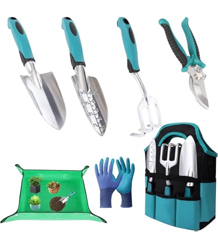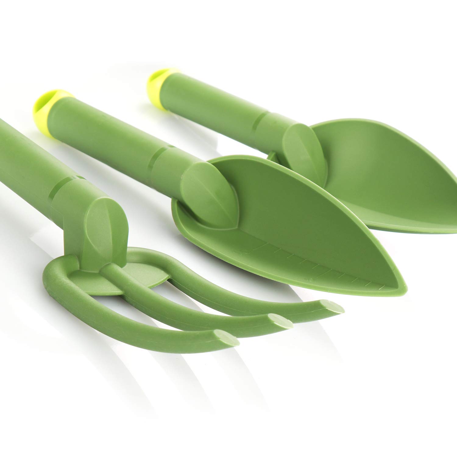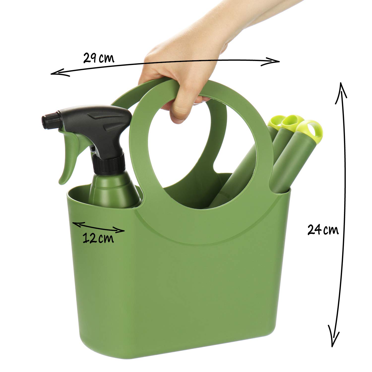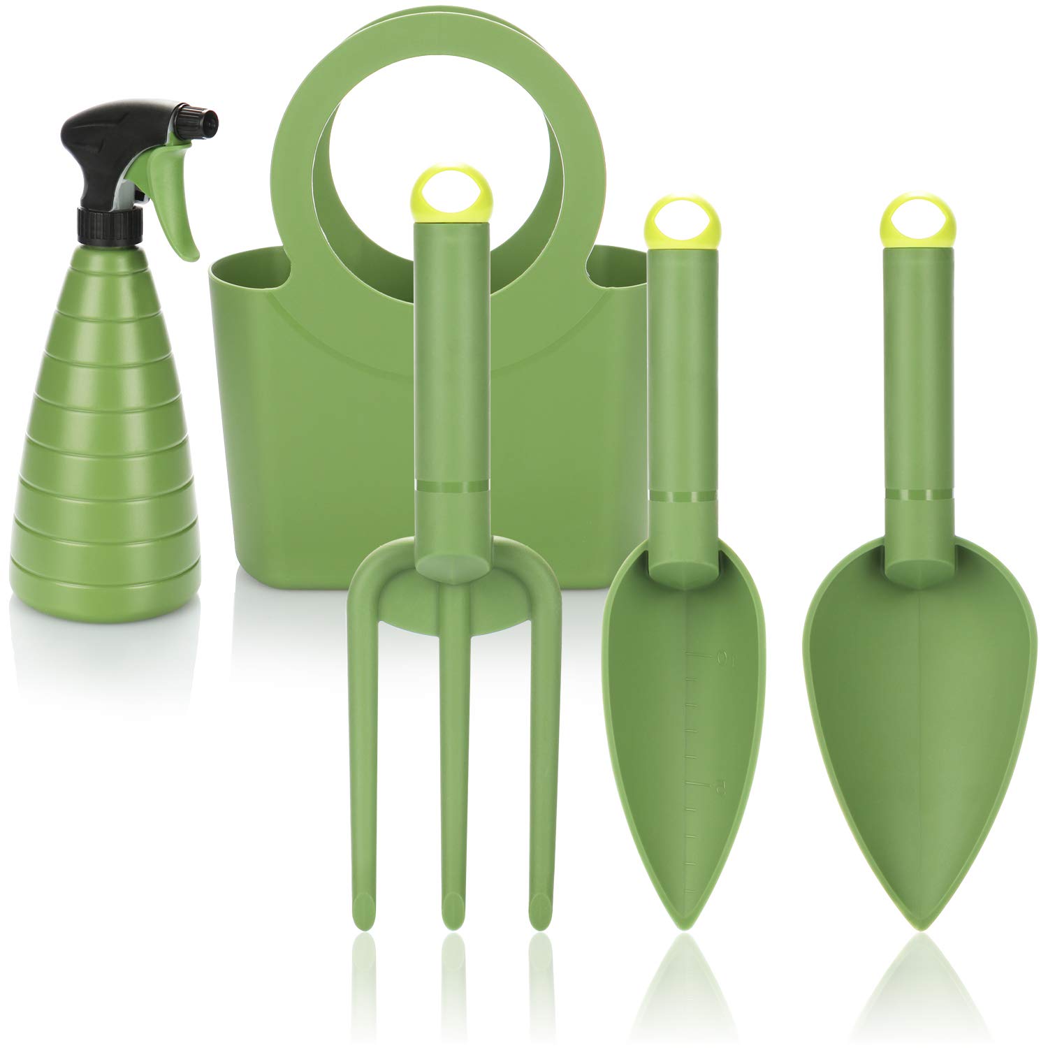 Perfektes Einsteiger-Set für kleine Gärtner und alle die es leicht mögen! 5 Teile im Set: Blumenkelle, Pflanzenschaufel, Blumengabel, Sprühflasche und praktische Tragetasche! Alles aus leichtem Kunststoff - ideal für Kinder und Senioren! Die ergonomischen Griffe liegen super in der Hand. Maße: Schaufel groß 28,5x9cm, Schaufel klein 28,5x6,5cm, Gabel 27,5x8cm, Sprühflasche 25x10cm (750ml Fassung). Die Schaufel hat sogar eine Skala zur Tiefenmessung - richtig professionell! Wetterfest und robust - hält auch wildem Gärtnern stand! Perfekt für Balkon, Blumenbeet oder Gewächshaus. Die bunte Aufmachung macht einfach Spaß! Einfach auspacken und losgärtnern - ob Umpflanzen, Säen oder Gießen! Macht Gartenarbeit zum puren Vergnügen!