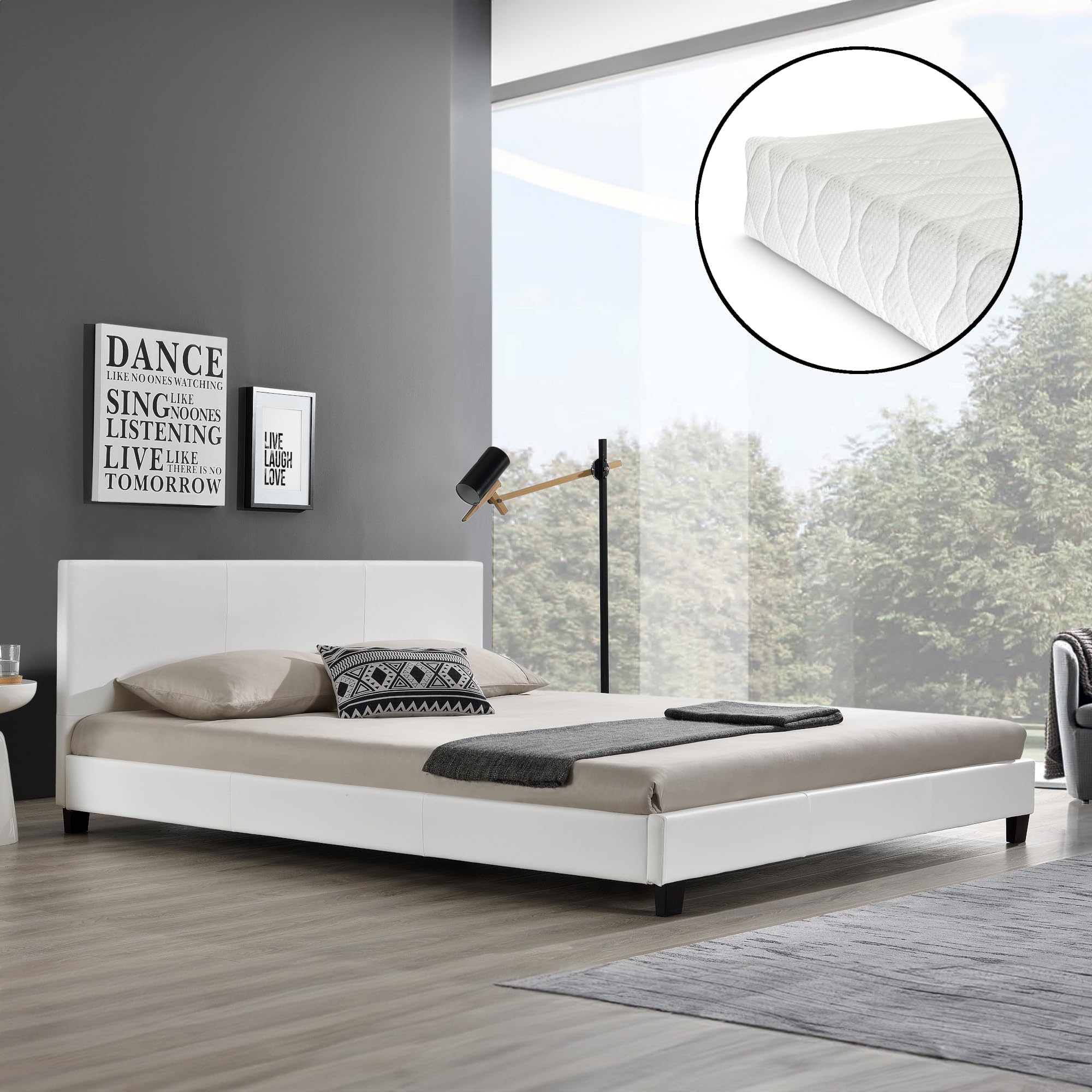 Schlaf wie auf Wolken! Dieses Corium Polsterbett in 160x200cm ist ein echter Hingucker im Schlafzimmer. Das weiße Kunstleder (100% Polyurethan) sieht nicht nur mega stylisch aus, sondern ist auch super pflegeleicht. Mit den Außenmaßen von 210x169cm und einer Kopfteilhöhe von 78cm macht das Bett was her! Im Lieferumfang ist alles enthalten was du brauchst: Das Bettgestell, einen Standard-Lattenrost und eine hochwertige Kaltschaummatratze. Die Matratze (160x200x16cm) ist allergikergeeignet, atmungsaktiv und hat eine exzellente Klimatisierung - im Sommer kühl, im Winter warm. Der Bezug aus 100% Polyester fühlt sich angenehm weich an. Der Zusammenbau ist straightforward und die stabile Bauweise garantiert lange Freude. Wichtig: Matratze und Bett werden separat verschickt, können also an unterschiedlichen Tagen ankommen. Die Lieferung erfolgt bis Bordsteinkante, Montage musst du selbst übernehmen. Aber keine Sorge - mit der Anleitung kriegst du das hin! Perfekt für alle die modernes Design und Komfort lieben. Schaff dir deine persönliche Wohlfühloase!