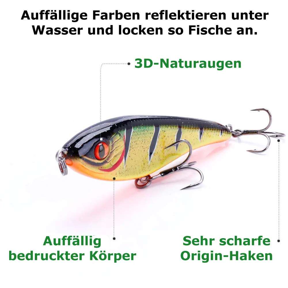 Angel-Fans, aufgepasst! Dieser 3D bionische Crankbait ist einfach genial. Er sieht aus wie ein kleiner Fisch und bewegt sich auch so - total lebensecht! Perfekt für Süß- und Salzwasser, lockt er Forellen, Barsche, Hechte und mehr an. Der Clou: Die einzigartige Propellerbewegung erzeugt unvorhersehbare Wasserstörungen, die Raubfische richtig aggressiv machen. Einfach werfen und einholen - keine komplizierte Technik nötig! Aus robustem ABS-Material hält er auch bei häufigem Einsatz was aus. Ob als Popper an der Oberfläche oder als Swimbait in der Tiefe - dieser Köder ist vielseitig einsetzbar. Mit Doppelhaken für sichere Bisse und mehr Fangerfolg. Probier ihn aus und überrasch dich selbst!