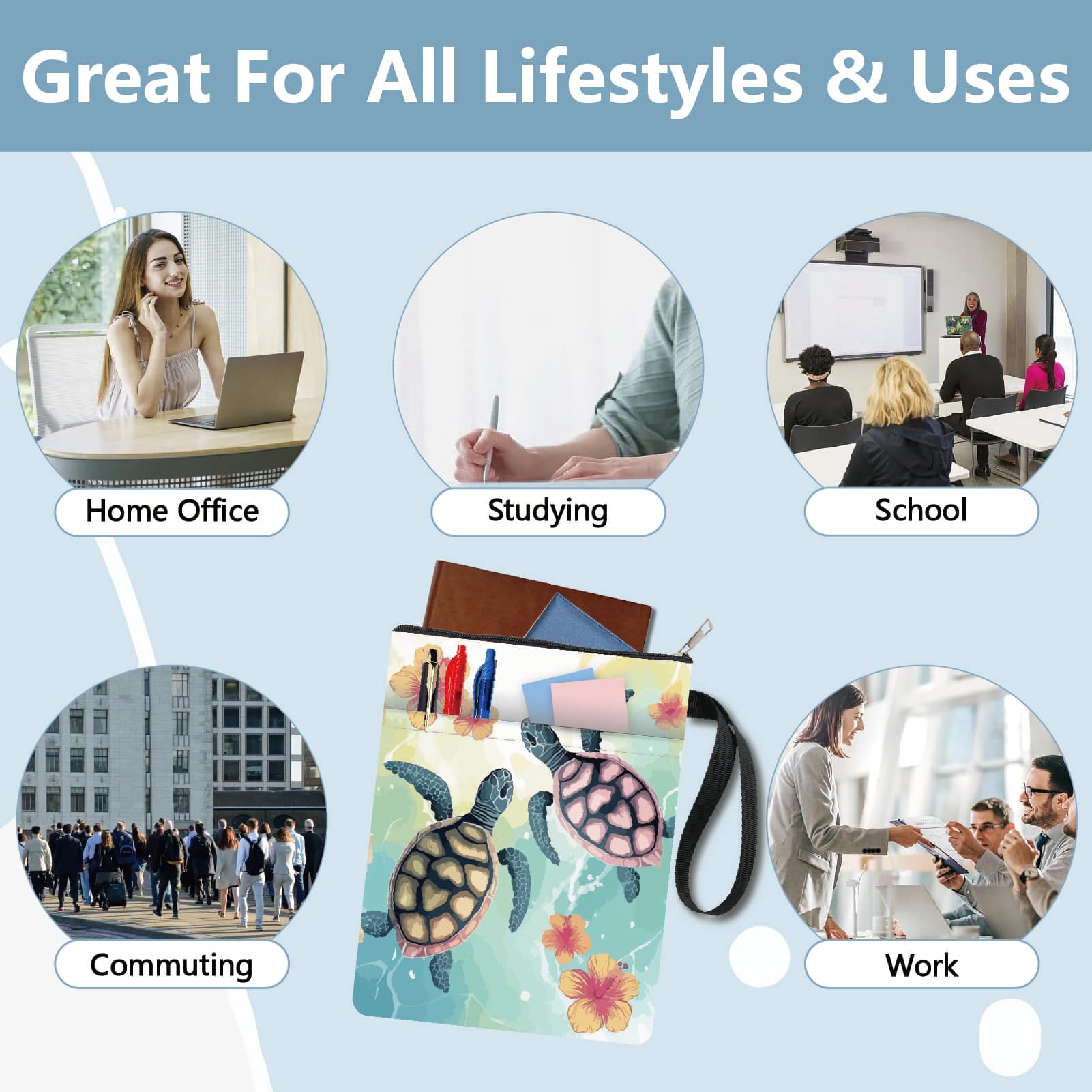 Schütze deine Bücher und Notizbücher mit dieser niedlichen Meeresschildkröten-Buchhülle! Das coole Ozean-Design mit der süßen Schildkröte sorgt für sommerliche Urlaubsstimmung - egal zu welcher Jahreszeit. Perfekt für alle, die ihre Bücher vor Schmutz, Wasser und Abnutzung bewahren wollen.\\n\\nHergestellt aus hochwertigem Stoff, ist die Hülle komplett wasserdicht und kann sogar gewaschen werden. Die Farben bleiben lange kräftig und leuchtend. Mit den Maßen 22x28 cm passt sie ideal zu Büchern bis 24x18x3 cm - also die meisten Taschenbücher und Notizbücher.\\n\\nSuper einfach in der Handhabung: Einfach Reißverschluss aufziehen, Buch reinlegen, Reißverschluss zu - fertig! Die praktische Vordertasche ist perfekt für Stifte, Kulis oder andere kleine Utensilien.\\n\\nAber die Hülle kann mehr als nur Bücher schützen! Sie eignet sich auch super für Tablets, als Reiseetui für Kosmetik oder einfach als stylische Aufbewahrungstasche. Ein tolles Geschenk für Bücherwürmer, Bibliothekare oder Buchclub-Mitglieder.\\n\\nMit dieser Hülle machst du nicht nur deine Bücher haltbarer, sondern verleihst ihnen auch noch einen individuellen Look. Praktisch, langlebig und einfach hübsch anzusehen!