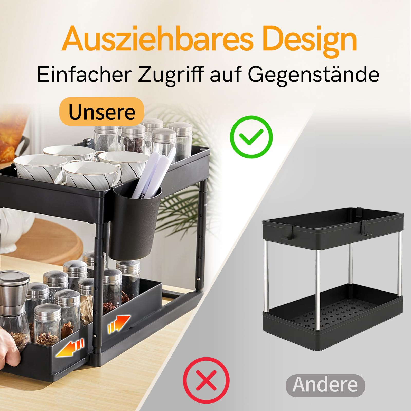 Dieser Creahaus Küchenorganizer bringt Ordnung unter deine Spüle! Mit 2 ausziehbaren Etagen (39x23x38 cm) und praktischen Haken für zusätzlichen Stauraum. Das L-förmige Design passt sich perfekt Abflussrohren an. Die gedämpften Schienen gleiten sanft und leise. Aus robustem ABS-Kunststoff und Metall - hält schweren Reinigungsmitteln stand. Einfach zu montieren mit Schrauben oder Klebeschienen. Ideal für Küche, Bad oder als Vorratsschrank-Organizer. Macht aus ungenutztem Platz wertvollen Stauraum!