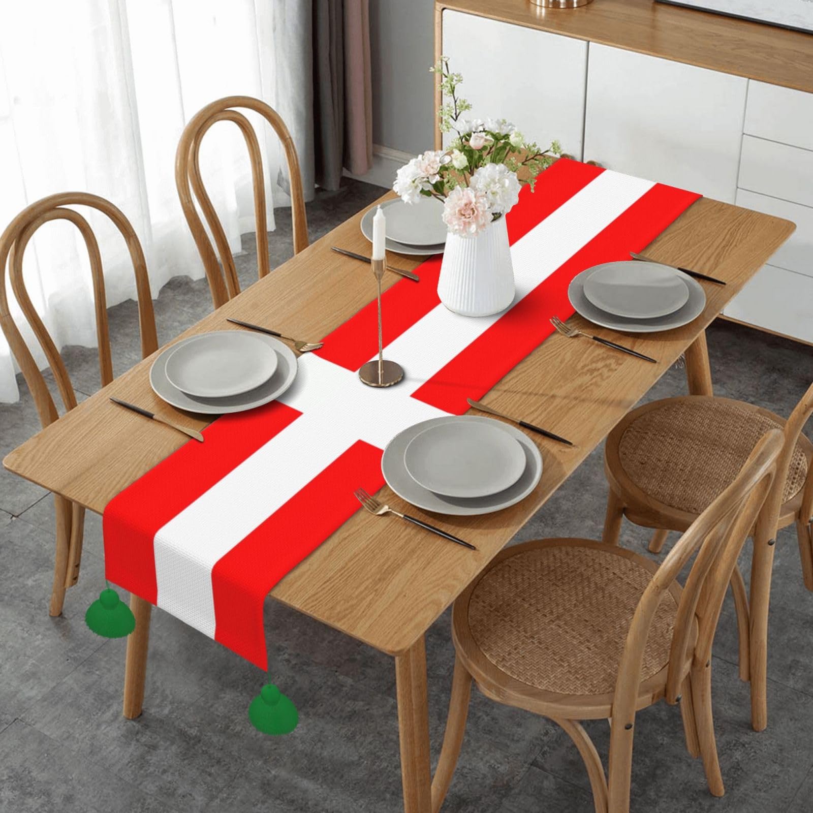 Hey Deko-Fan! suchst du eine fröhliche Tischdeko für dein Zuhause? Dieser Tischläufer mit dänischer Flagge bringt skandinavisches Flair auf deinen Tisch! Mit 33x91cm passt er perfekt auf Esstische, Kommoden oder Sideboards.