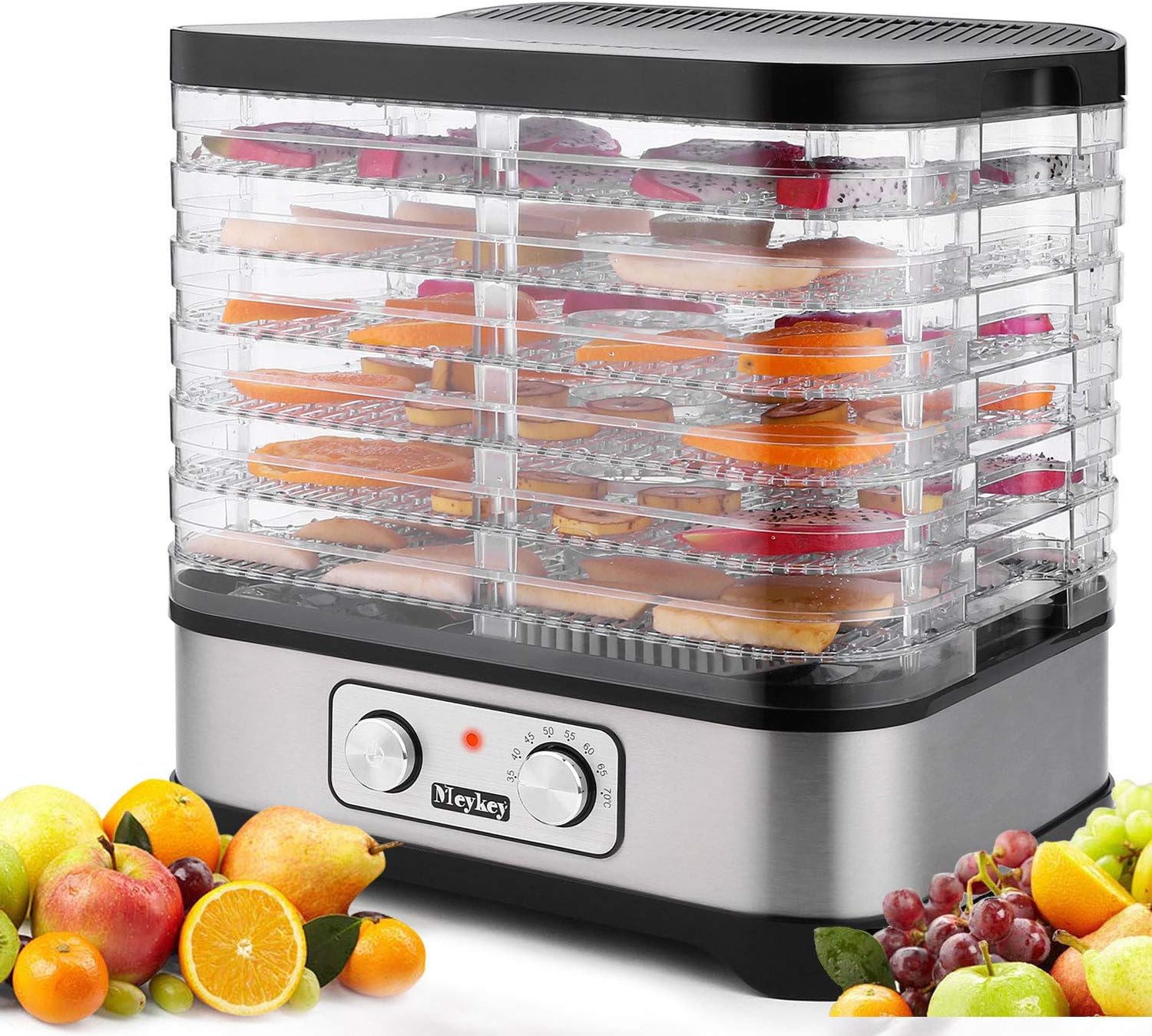 Eigene gesunde Snacks herstellen? Mit diesem Dörrgerät ganz einfach! Die 8 Etagen bieten jede Menge Platz für Obst, Gemüse, Kräuter oder sogar Fleisch. Das digitale Display mit Timer (bis 72 Stunden) und Temperaturregelung (42-70°C) gibt dir volle Kontrolle.