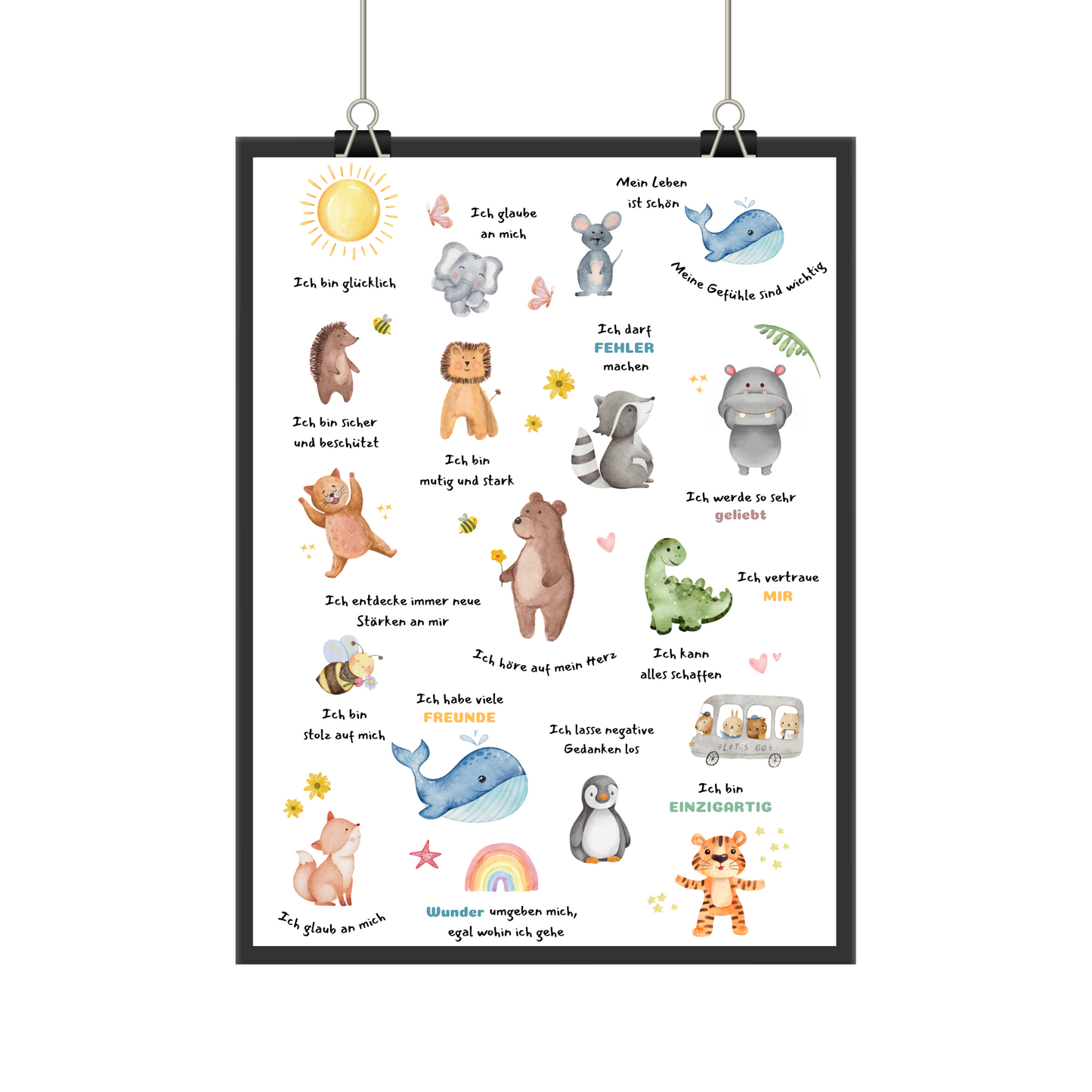 Lemina Affirmationsposter Kinderzimmer - 3er Set DIN A4 Mit Tierbildern & Positiven Botschaften
