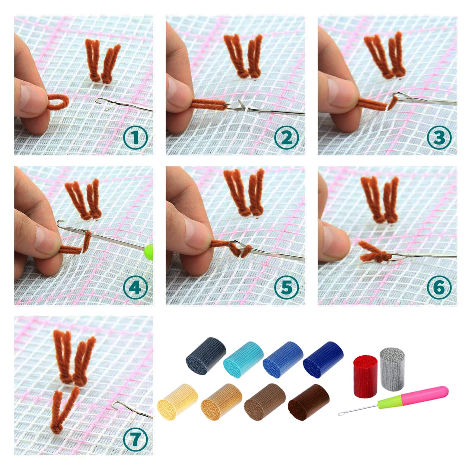 Entdecke die entspannende Welt des Teppichknüpfens! Dieses komplette Set enthält alles, was du brauchst: Häkelnadel, bunte Wolle, Mesh-Grundstoff und einfache Anleitung. Perfekt für Anfänger und Fortgeschrittene. Der fertige Teppich wird weich, gemütlich und ein echter Hingucker! Ideal zum Stressabbau - einfach abschalten und kreativ werden. Tolles Familienerlebnis, auch für Kinder ab 7 Jahren (unter Aufsicht). Das Muster ist auf dem Stoff vorgezeichnet, du musst nur noch die Farben zuordnen. Wird zur Fußmatte, Wandbehang oder Sofakissen. Einzigartiges Geschenk für kreative Menschen. Mach dein Zuhause gemütlicher mit deinem eigenen Kunstwerk!