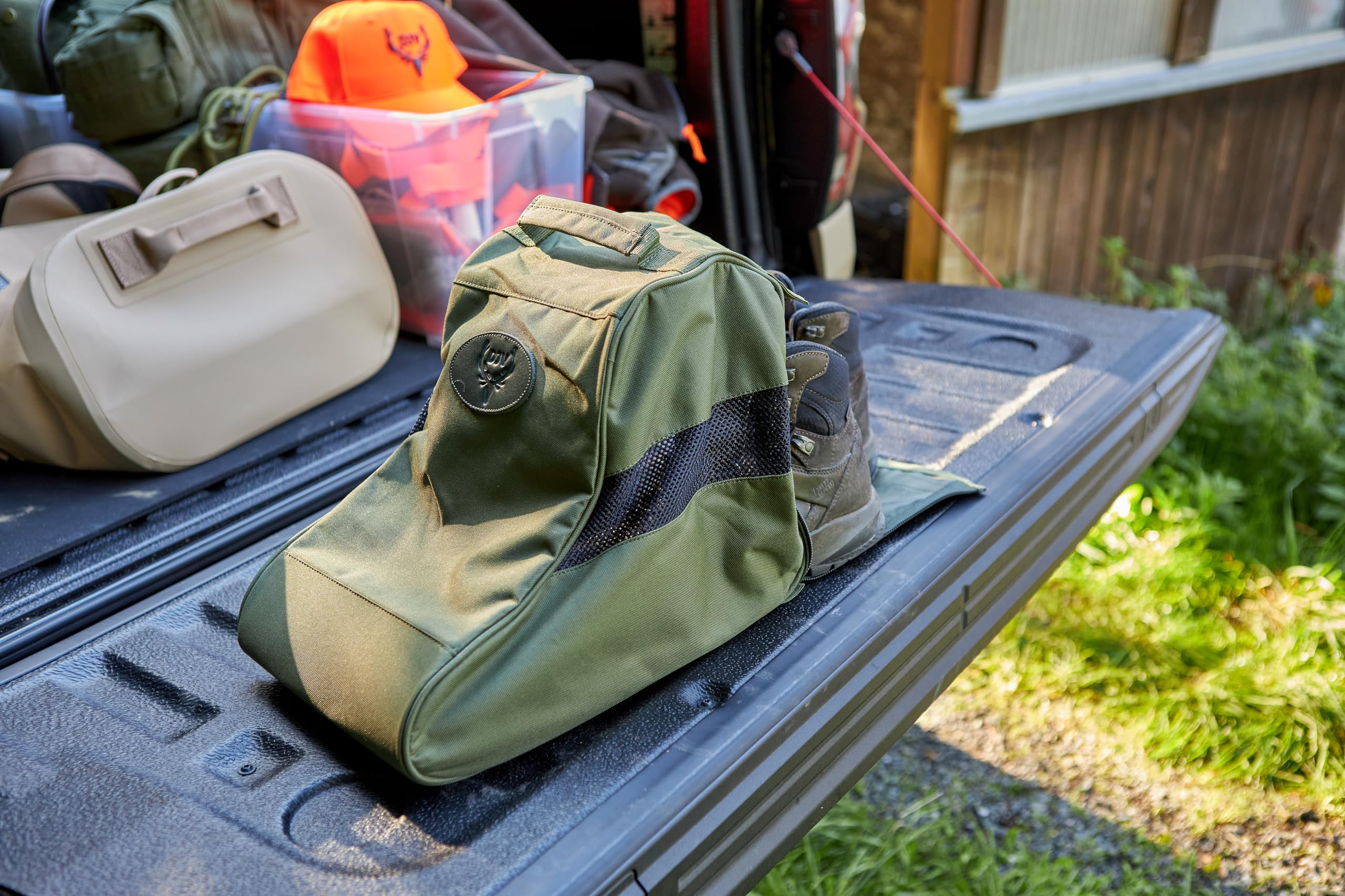 Schluss mit dreckigen Autositzen! Diese praktische Schuhtasche vom DJV ist die Rettung für alle, die nach dem Wandern oder Jagen nasse, matschige Schuhe transportieren müssen. Passt für alle Schuhe bis Größe 48 mit 24cm Schafthöhe. Seitliche Lüftungsnetze sorgen für Luftzirkulation, der Tragebügel macht das Handling super einfach. Mit Reißverschluss schnell geöffnet und bei Nichtgebrauch platzsparend zusammengefaltet. Das grüne Design mit DJV-Logo in Lederoptik sieht dabei noch richtig gut aus. Halte dein Auto sauber - egal wie dreckig deine Schuhe sind!