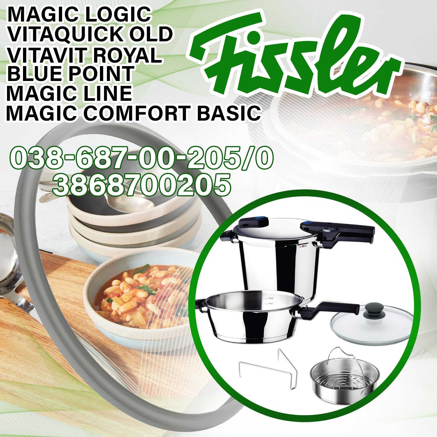 Passend auf, wenn dein Schnellkochtopf nicht mehr richtig dichtet! Dieser hochwertige Ersatz-Dichtring von DL-pro ist die perfekte Lösung für Fissler Schnellkochtöpfe mit 26 cm Durchmesser. Er ersetzt genau die Original-Teilenummer 038-687-00-205 bzw. 3868700205.\n\nDer Ring ist aus lebensmittelechtem Silikon gefertigt - das heißt er ist geruchsneutral, hitzebeständig und absolut hygienisch. Er sorgt für eine zuverlässige Abdichtung zwischen Topf und Deckel, damit dein Schnellkochtopf wieder perfekt funktioniert und du energiesparend und vitaminschonend kochen kannst.\n\nKompatibel ist der Dichtring mit vielen Fissler Serien:\n• Vitaquick\n• Blue-Point\n• Magic Line\n• Magic Comfort\n• Vitavit Royal, Comfort und Premium\n\nDer Austausch ist super einfach - einfach den alten Ring rausnehmen, neuen reinlegen und schon kann's wieder losgehen mit dem Druckgaren. Als Verschleißteil solltest du den Dichtring alle 2-3 Jahre austauschen, damit dein Schnellkochtopf immer optimal und vor allem sicher funktioniert.\n\nWichtig: Bitte vor dem Kauf prüfen, ob der Ring zu deinem speziellen Topfmodell passt. DL-pro steht für Premium-Qualität - das merkst du an der präzisen Passform und der Langlebigkeit des Materials. Nie wieder undichte Schnellkochtöpfe!