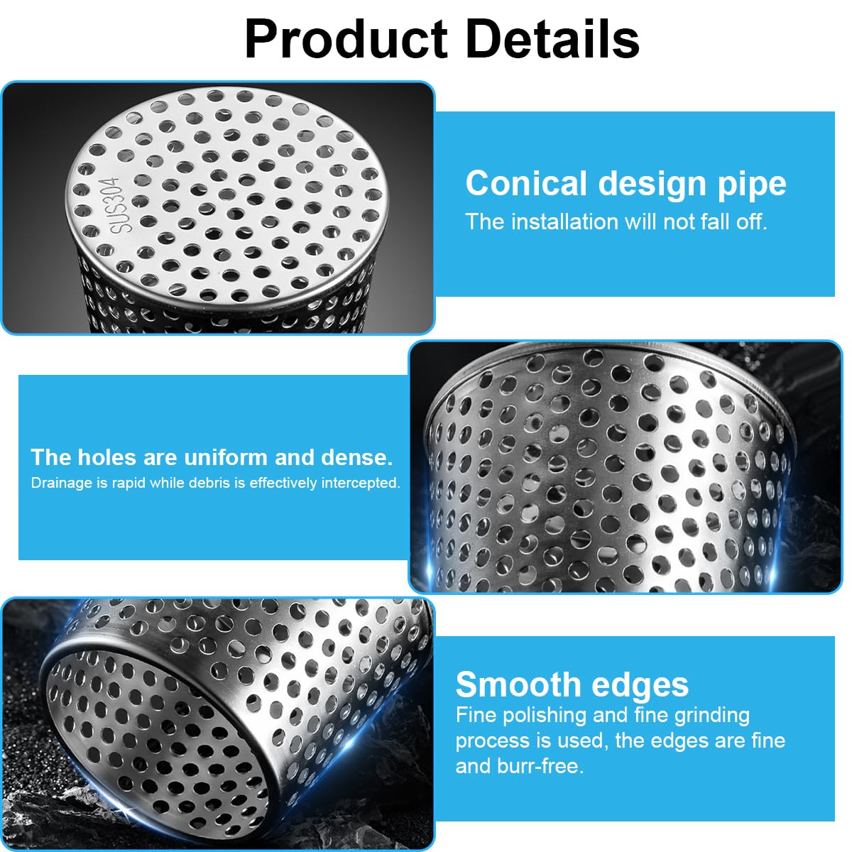 Das konische Design leitet das Wasser effizient ab und sitzt dabei bombenfest auf den Rohren. Aus rostfreiem Edelstahl 304 gefertigt, hält er auch bei extremem Wetter problemlos stand.