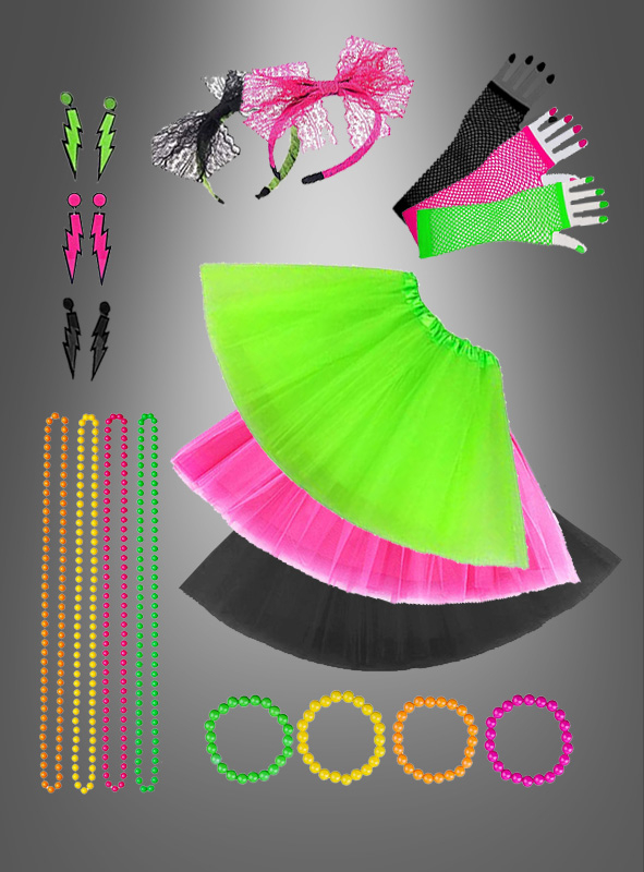 Back to the 80s! Dieses komplett Set verwandelt dich in einen echten 80er Jahre Star. Enthalten sind 19 Teile: Tutu-Rock, fingerlose Netzhandschuhe, Beinlinge, Neon-Halskette, Spitzen-Stirnband, Blitzohrringe und 10 bunte Silikonarmbänder. Der Tutu-Rock aus weichem Nylon ist dehnbar und bequem. Die Accessoires in knalligen Neon-Farben machen dich zum Blickfang auf jeder Party. Perfekt für 80er Jahre-Partys, Disco-Abende, Kostümfeste oder Geburtstagsfeiern. Einfach mix and match für deinen individuellen Look. Das Set ist eine tolle Geschenkidee für Freundinnen, Schwestern oder Kolleginnen. Mit diesen Teilen bist du der Star jeder Feier und sorgst garantiert für gute Laune und viele Komplimente!