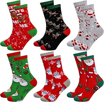 Oh, du fröhliche... Sockenzeit! Dieses 6er-Set Weihnachtssocken bringt sofort Festtagsstimmung in dein Zuhause. Mit süßen Motiven von Weihnachtsmännern, Rentieren und Schneeflocken in den klassischen Weihnachtsfarben Rot, Grün und Weiß. Die Socken sind aus 80% Baumwolle, 18,5% Polyester und 1,5% Elasthan - super weich und kuschelig! Sie passen für die Größen 36-44 und sind schön elastisch, sodass sie nicht rutschen oder einschneiden. Perfekt als Hausschuhe-Ersatz in der kalten Jahreszeit! Das Material ist atmungsaktiv und leitet Feuchtigkeit ab - keine schwitzigen Füße mehr. Auch nach häufigem Waschen bleiben sie formstabil und weich. Super als Geschenk für die ganze Familie oder für die eigene Weihnachtsparty! Einfach anziehen, Tee trinken und die festliche Atmosphäre genießen. Diese Socken sind nicht nur warm, sondern machen auch richtig gute Laune! Ob unterm Christbaum oder auf der Weihnachtsfeier - mit diesen Socken bist du immer festlich gestylt!