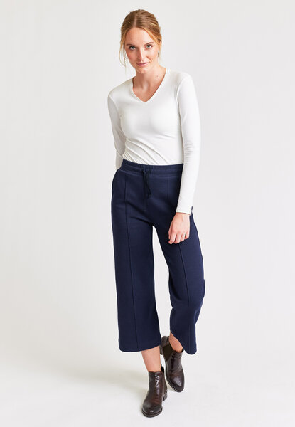 Hochtaillierter Schnitt mit elastischem Bund und weiter Beinform für luftige Eleganz. Mit zwei praktischen Seitentaschen - stylisch und funktional zugleich. Das schlichte Design ist zeitlos und vielseitig kombinierbar.