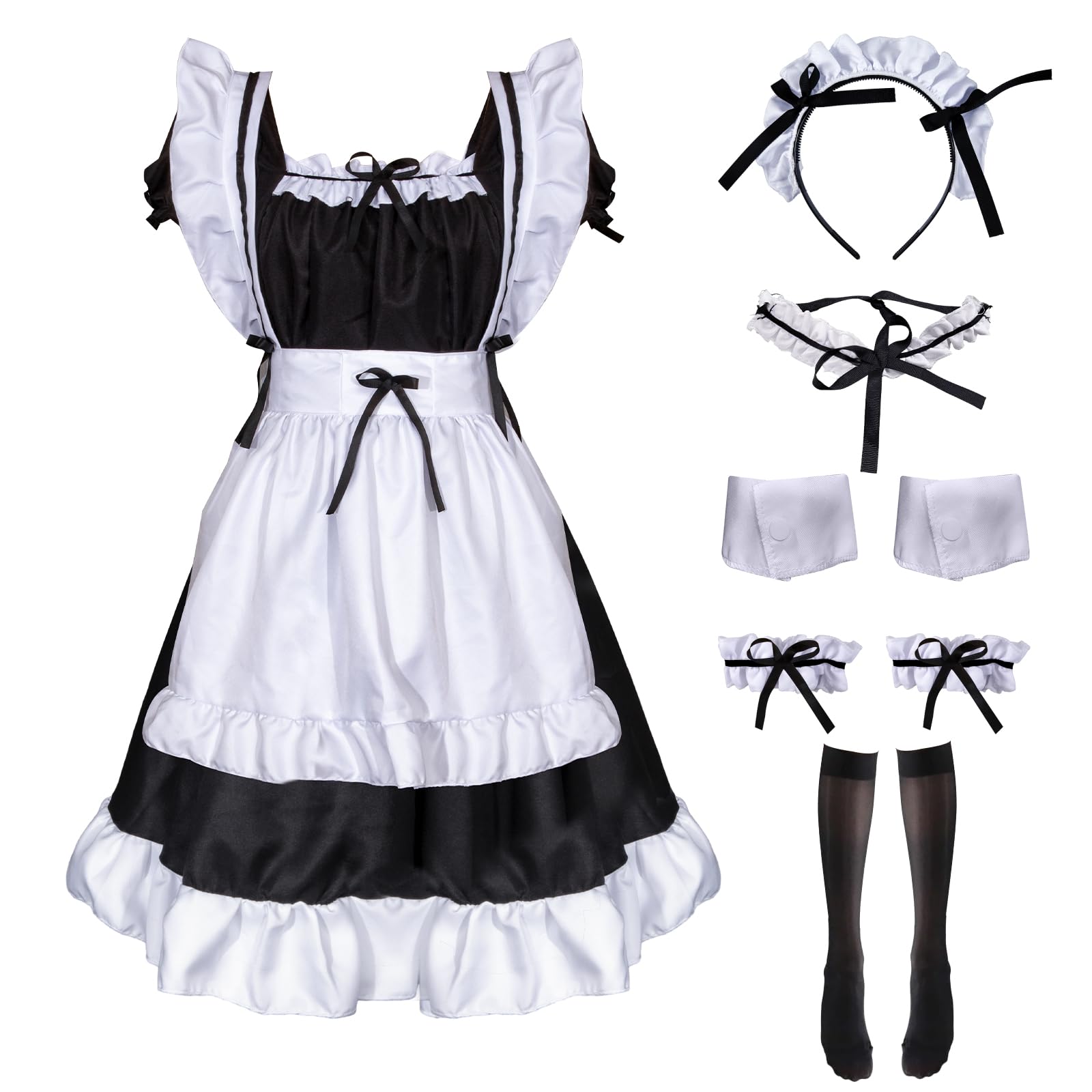 Süß und verführerisch! Dieses French Maid Kostüm-Set enthält alles für den perfekten Look: Kleid, Schürze, Kopfschmuck und 3 Bögen. Aus weichem Polyester, angenehm zu tragen. Der Taillengürtel ist verstellbar für perfekte Passform. In Größen M bis XXL erhältlich. Perfekt für Cosplay, Halloween, Karneval oder Mottopartys. Das klassische Schwarz-Weiß-Design mit Spitzenverzierungen sieht einfach zeitlos aus. Mach dich bereit für unvergessliche Auftritte!