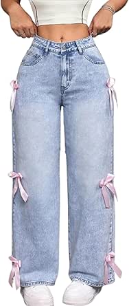 PEAINJ Baggy Jeans Damen - Harajuku Style Mit Schleife, Hohe Taille, Gerades Bein