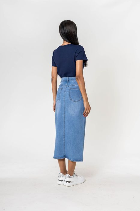 Suchst du einen Rock, der einfach zu allem passt? Dieser Jeansrock ist dein neuer Liebling für jeden Tag! Mit der hohen Taille betont er deine Figur perfekt und der seitliche Schlitz gibt dir jede Menge Bewegungsfreiheit.\n\nWas diesen Rock besonders macht: Das weiche Stretch-Material fühlt sich an wie eine zweite Haut und dehnt sich mit jeder Bewegung mit. Du kannst dich problemlos bücken, setzen oder treppensteigen - der Rock bleibt immer bequem.\n\nDie praktische Knopfleiste vorne sieht nicht nur stylisch aus, sondern macht das An- und Ausziehen super einfach. Die seitlichen Taschen sind übrigens nicht nur Deko - du kannst wirklich dein Handy oder Schlüssel darin verstauen!\n\nPerfekt kombinierbar mit:\n- Einem einfachen T-Shirt für den lässigen Look\n- Einem Blazer fürs Büro\n- Stiefeletten im Herbst\n- Sandalen im Sommer\n\nOb für die Arbeit, einen Stadtbummel oder ein Date - dieser Rock ist immer die richtige Wahl. Und das Beste: Er ist maschinenwaschbar und behält auch nach häufigem Tragen seine Form und Farbe.\n\nIn verschiedenen Größen erhältlich - such einfach deine normale Konfektionsgröße aus und freu dich auf einen Rock, der wirklich passt!