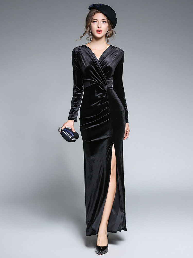 LUVCES Damen Maxi Kleid Langarm - V-Ausschnitt, Plissee, Mit Seitenschlitz