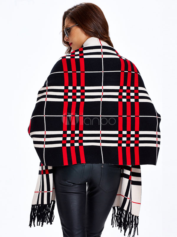 TOSHIKII Damen Poncho Mit Rollkragen - Karierter Wickelpullover Mit Quasten